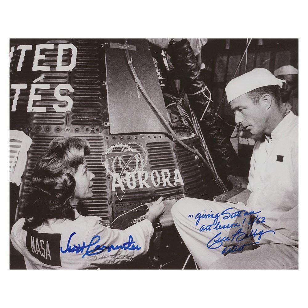 Satin-finish 10 x 8 photo of Mercury artist Cece Bibby talking to Scott Carpenter as she paints his Aurora 7 spacecraft, signed in blue felt tip, "Scott Carpenter" and "'Giving Scott an art lesson! 5/62, Cece Bibby, artist." In very fine condition.