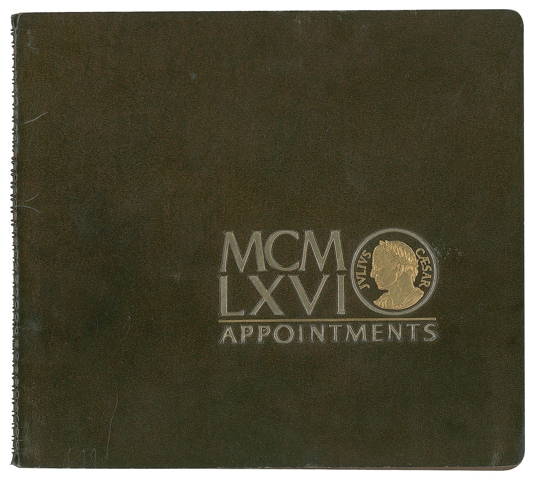 Scott Carpenter's spiral-bound appointments calendar for the year 1966, 10 x 9, with the majority of inner pages annotated in pencil and ink by a secretarial hand; Carpenter's handwriting appears infrequently. Notable remarks or comments include: March 7th ("Cape Kennedy Third Space Congress"); March 24 ("Sailing Hydrofoil"); March 26th ("Boston Sea Rovers"); close of May features the acronym "DSSPII," which stands for 'Deep Submergence Systems Project'; the first two weeks of June are filled in with "USSR;" empty spaces at close of months June and July note "DSSPI" and "DSSPII"; and August 8-10 lists "LA Marine Systems Conf." The calendar also features several notes bearing the surname "Craven," a reference to John Piña Craven, the US Navy's head of the Deep Submergence Systems Project, which oversaw the experimental underwater habitat SEALAB project Carpenter joined in 1964. In fine condition, with light handling wear.