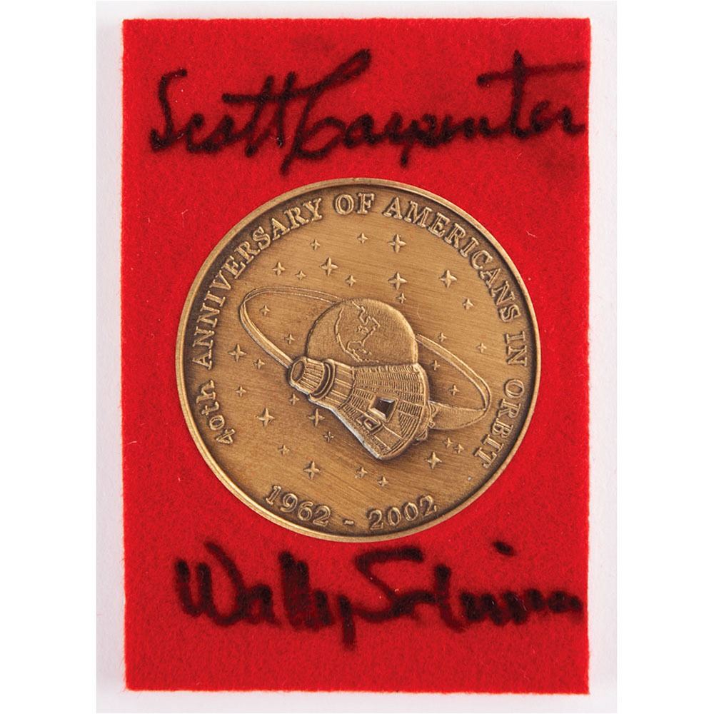 Scott Carpenter‰Ûªs bronze-tone medallion, 1.5è in diameter, with the front showing an embossed image of a Mercury capsule orbiting Earth with encircled text, ‰ÛÏ40th Anniversary of Americans in Orbit, 1962‰ÛÒ2002,‰Û and the reverse bearing raised text: ‰ÛÏCommemorating the 40th Anniversary of Americans in Orbit, this medallion contains metal from Mercury Atlas launch pad 14.‰Û Includes its original plastic case and red felt holder, which is signed on the front and back in black felt tip by Scott Carpenter, Wally Schirra, John Glenn, and Gordon Cooper. In fine condition. Accompanied by a certificate of authenticity from Stephen Hankow of Farthest Reaches, which affirms that this medallion ‰ÛÏcomes from the personal archives of Astronaut Scott Carpenter.‰Û