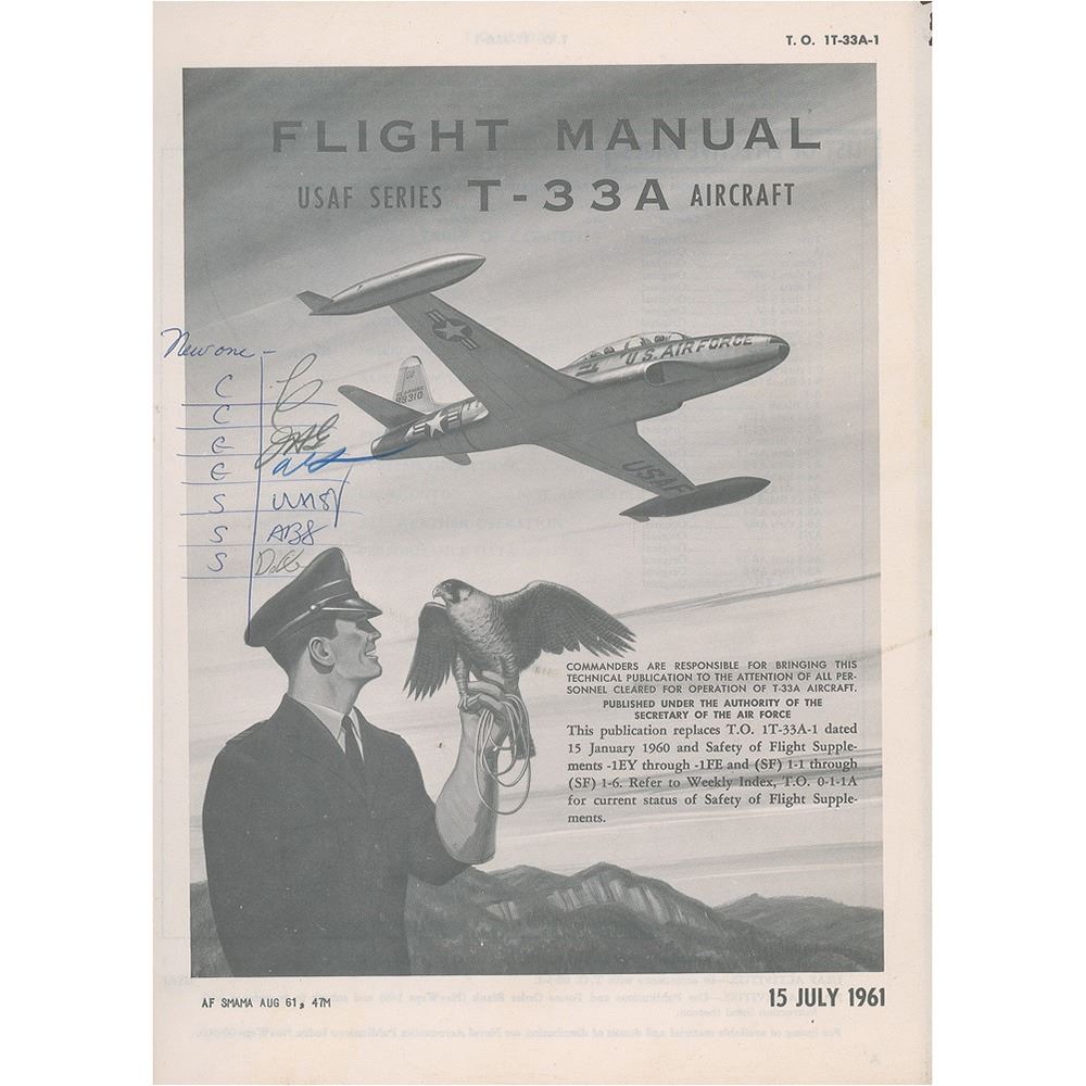 Scott Carpenter’s bracket-bound United States Air Force flight manual for the T-33A aircraft, dated July 15, 1961, 9 x 11.5, with the front page initialed by six of the Mercury astronauts in pencil or ballpoint: Scott Carpenter, “C.,” John Glenn, “J.H.G,” Gus Grissom, “V.G.,” Wally Schirra, “W.M.S.J.,” Alan Shepard, “A.B.S.,” and Deke Slayton, “D. K.” The manual consists of the following nine sections: Description, Normal Procedures, Emergency Procedures, Auxiliary Equipment, Operating Limitations, Flight Characteristics, Systems Operation, Crew Duties, and All Weather Operation. In fine condition. Accompanied by a signed certificate of authenticity from Farthest Reaches owner Stephen Hankow, who affirms that this manual derives from the Scott Carpenter Family Collection.