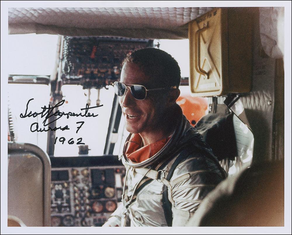 Color satin-finish 10 x 8 photo of Carpenter onboard a helicopter following his Mercury flight, signed in black felt tip “Scott Carpenter, Aurora 7, 1962.” In fine condition with a couple of bends.