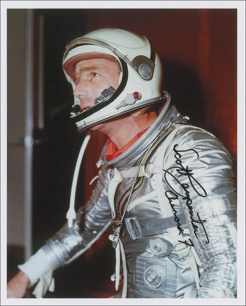 Color satin-finish 8 x 10 photo of Carpenter in his silver spacesuit, signed in black ink, “Scott Carpenter, Aurora 7.” In very fine condition.
