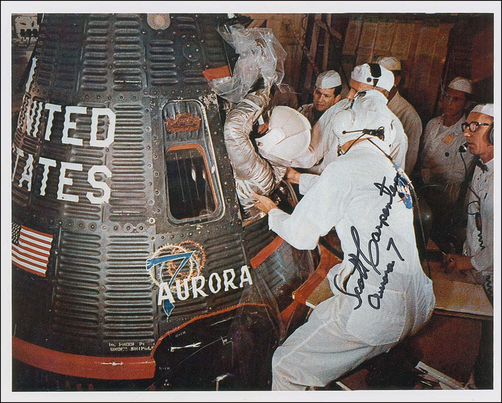 Color satin-finish 10 x 8 photo of Carpenter being helped into his Mercury capsule prior to launch, signed in black felt tip, “Scott Carpenter, Aurora 7.” In very fine condition.