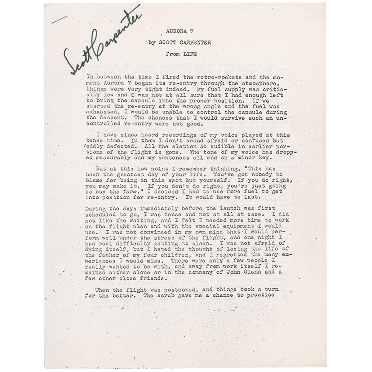 Photocopied article entitled “Aurora 7 by Scott Carpenter,” from Life magazine, 11 pages, 8.5 x 11, signed on the first page in black felt tip. In fine condition, with a staple to top left corner.