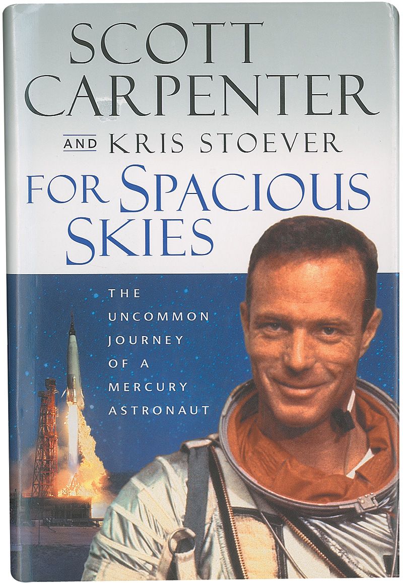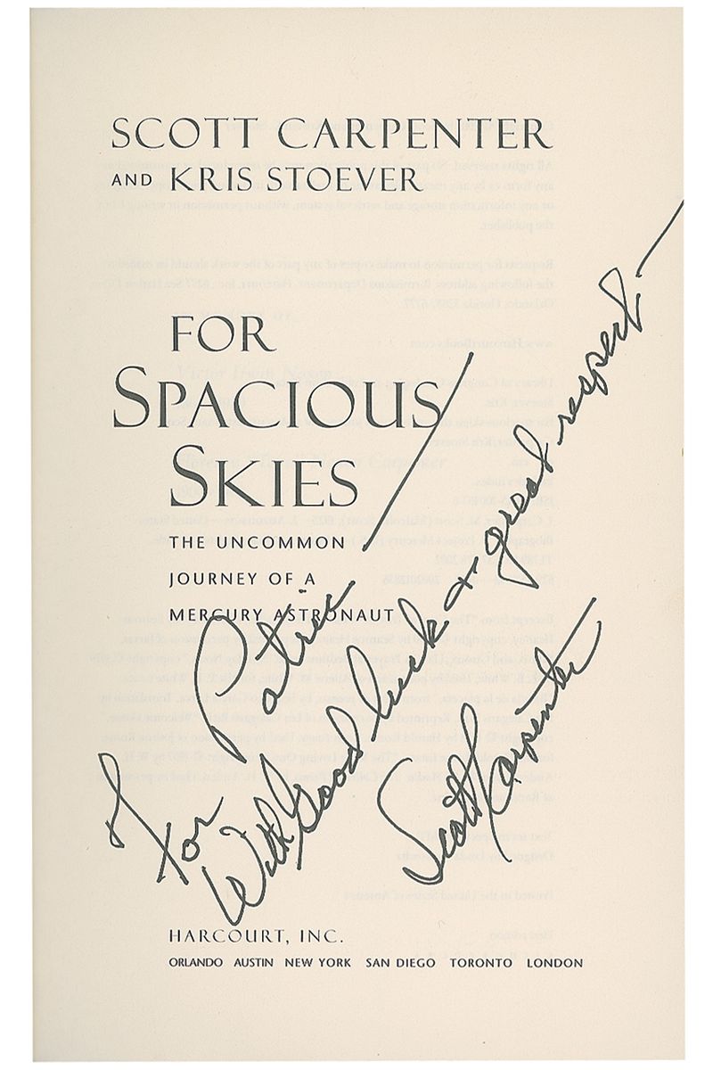 Signed book: For Spacious Skies. First edition. Orlando: Harcourt, Inc., 2002. Hardcover with dustjacket, 6.25 x 9.25, 370 pages. Signed and inscribed on the title page, “For Patric—With good luck & great respect—Scott Carpenter.” In fine condition, with some scattered light wear to dustjacket.