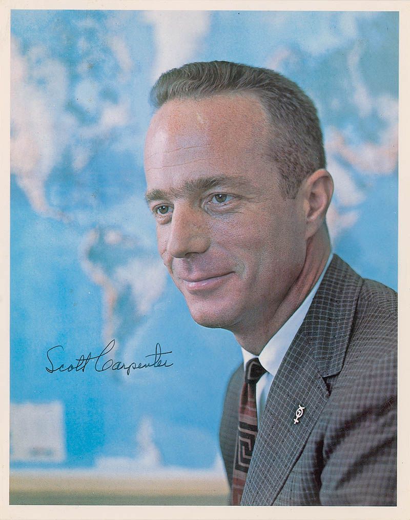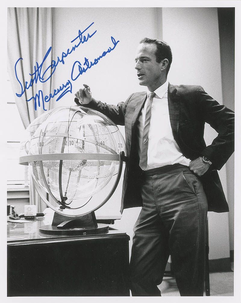 Two photos: a vintage color 8 x 10 NASA photo, signed in black ink; and a satin-finish 8 x 10 of Cooper leaning on a large globe, signed in blue felt tip, “Scott Carpenter, Mercury Astronaut.” In fine condition, with some light surface marks to color photo.