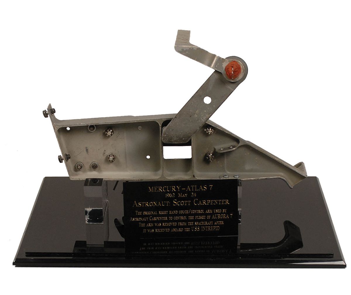 Flown right hand couch/control arm, flown on board Scott Carpenter’s Aurora 7 flight on May 24, 1956. Metal arm and bracket measure approximately 13 x 8 x 5.5, with an articulating lever with a partial handle. Bracket is screwed into a 17 x 11 Lucite display base, with an informational plaque which states “The original right hand/couch control arm used by astronaut Scott Carpenter to control the flight of Aurora 7. The arm was removed from the spacecraft after it was received aboard the U.S.S. Intrepid.” In fine condition. An early and very important flown artifact.