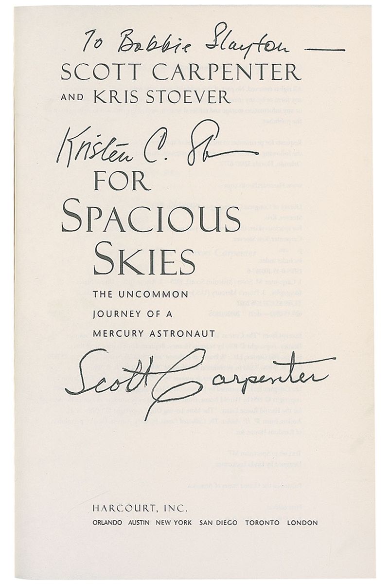 Signed book: For Spacious Skies. First edition. Orlando: Harcourt, Inc., 2002. Hardcover with dust jacket, 6.5 x 9.25, 370 pages. Signed on the title page in black ink by Carpenter, and also signed and inscribed to Bobbi Slayton on the title page by co-author Kristen Stoever. In fine condition, with scattered light wear to dustjacket. Accompanied by a 2003 TLS from Stoever to Bobbi Slayton.