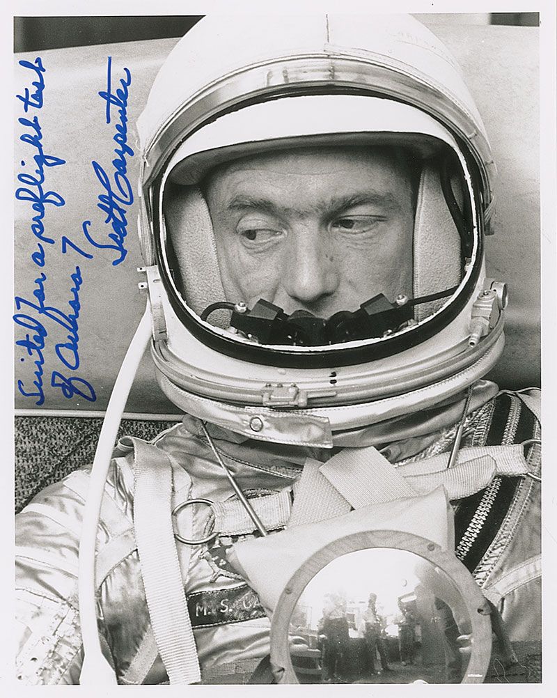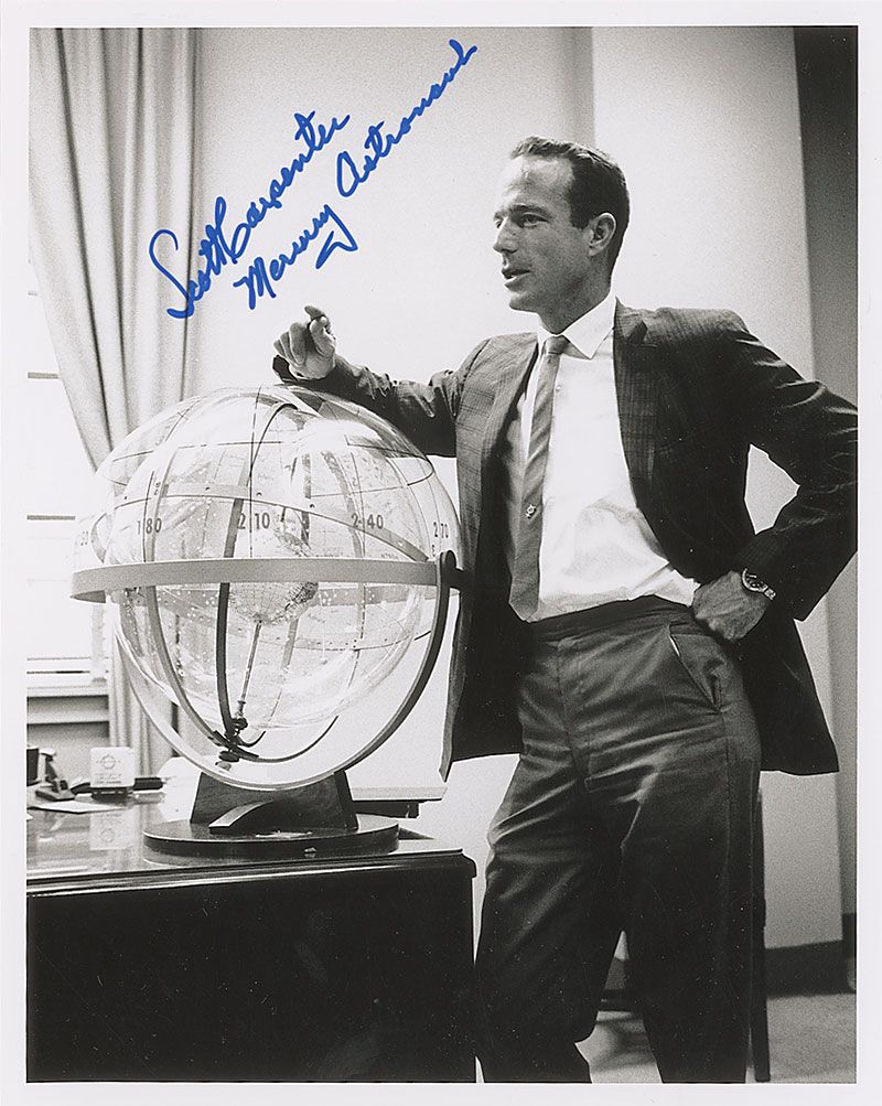 Two satin-finish 8 x 10 photos of Carpenter during the Mercury program, each signed in blue felt tip (one signed vertically), adding brief information to both photos. In very fine condition.