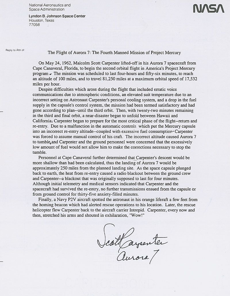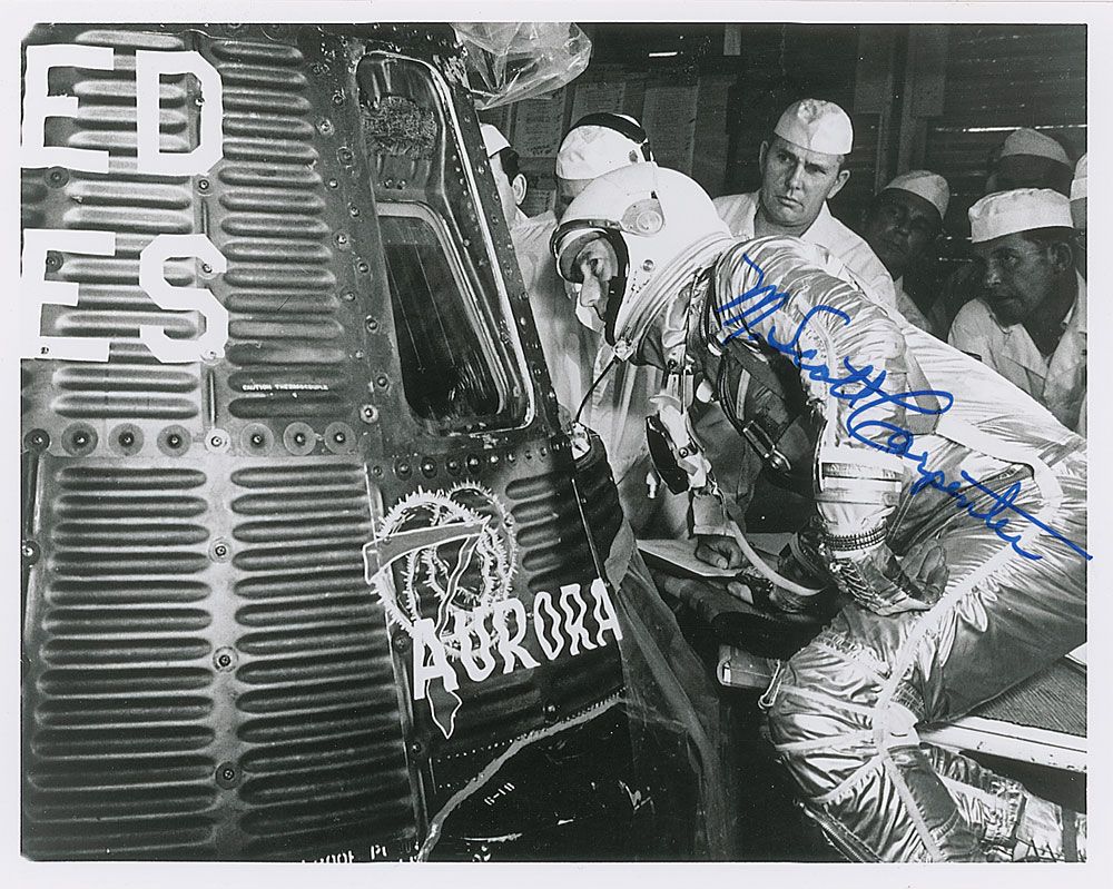 Two items: souvenir typescript detailing the touch and go descent of his space capsule, one page, 8.5 x 11, NASA letterhead. In part, “Due to a malfunction in the automatic controls…Carpenter was forced to assume manual control of his craft,” signed at the bottom in black ink, “Scott Carpenter, Aurora 7”; and a satin-finish 10 x 8 photo of Carpenter peering into the Aurora 7 capsule, signed in blue felt tip, “M. Scott Carpenter.” In overall fine condition.