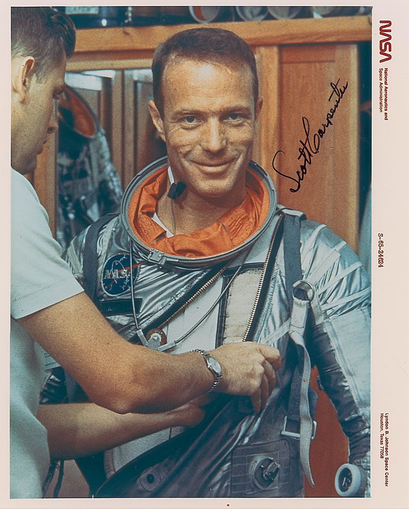 Color satin-finish 8 x 10 ‘red-numbered’ NASA photo of Carpenter getting suited up for his Mercury flight, signed in black felt tip. In very fine condition.