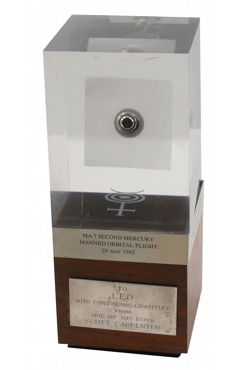 Original engine start button from Atlas launch vehicle No. 107-D used to send Carpenter’s Aurora 7 spacecraft into orbit for his MA-7 mission on May 24, 1962. The button is attractively encased in a block of Lucite presented on a wooden base, measuring an overall 4 x 9.5 x 4. Display bears plaques on all four sides, reading: “MA-7 Second Mercury Manned Orbital Flight, May 24, 1962,” “Engine Start Button from Atlas 107-D Launch, AMR Complex 14,” “National Aeraonautics and Space Administration, Cape Canaveral, Florida,” and “General Dynamics Astronautics.” Also bears a presentation plaque affixed to the front, “To Leo, with continuing gratitude from one of his boys, Scott Carpenter.” Some scattered marks to Lucite and presentation plaque slightly tarnished and crooked, otherwise fine condition. Carpenter originally gave this to Leo DeOrsey, his friend and a well-known attorney for the Mercury 7 astronauts. Originates from the personal collection of his son, Bob DeOrsey. Accompanied by a 1963 article from Parade magazine that mentions the button.