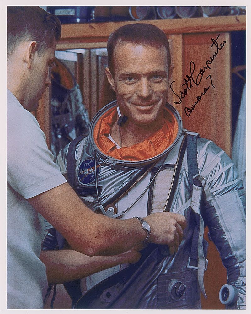 Color satin-finish 8 x 10 photo of Carpenter being suited in his Mercury space suit, signed in black felt tip, “Scott Carpenter, Aurora 7.” In very fine condition.