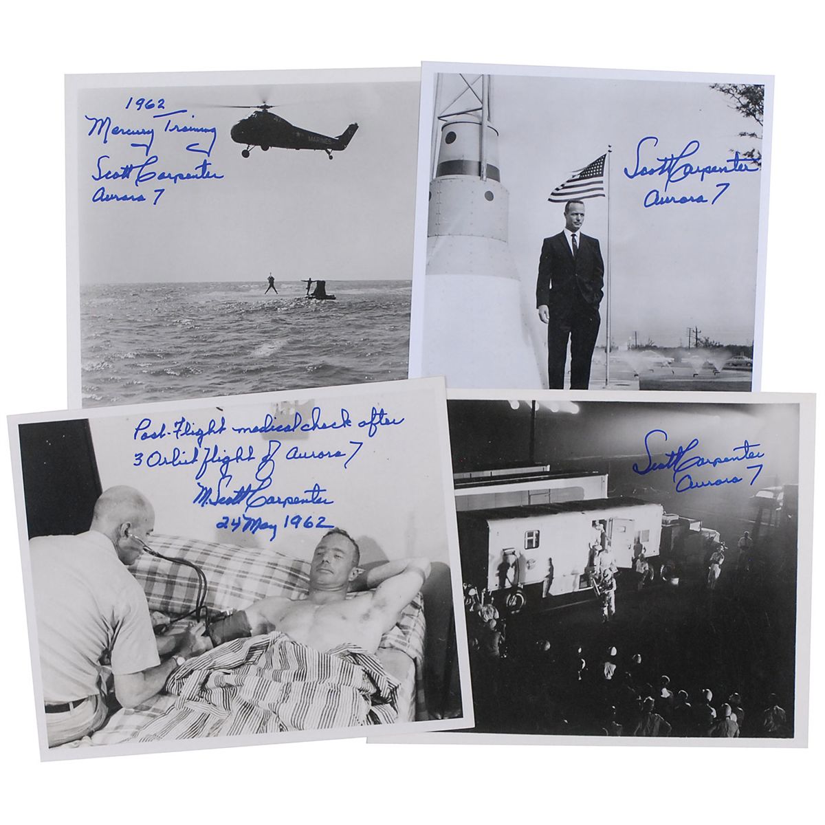 Four signed photos of Carpenter around the time of his mission, various finishes, each signed in blue felt tip by Carpenter, adding small descriptions to two of the photos. In fine condition, with some irregular ink adhesion to one signature, and a few corner tip creases.