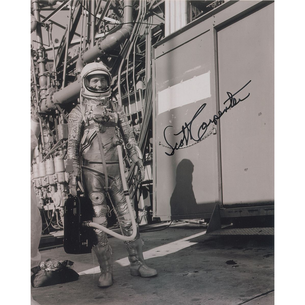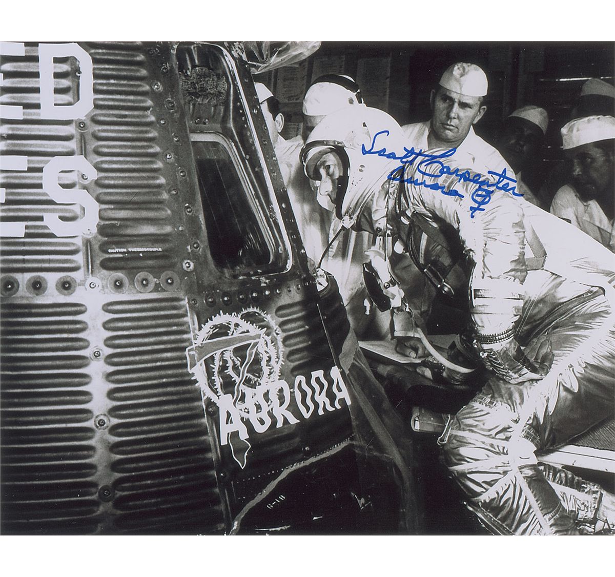 Two satin-finish photos of Carpenter at the time of his Mercury flight, one 8 x 10 and one 10 x 8, each signed in felt tip, adding “Aurora 7,” to one photo. In fine condition.