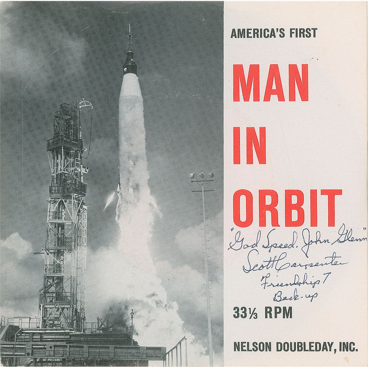 Seven-inch 33 1/3 album entitled “America’s First Man in Orbit,” signed on the sleeve in black ballpoint, “‘God Speed John Glenn’ Scott Carpenter, Friendship 7 Back-up.” In fine condition.