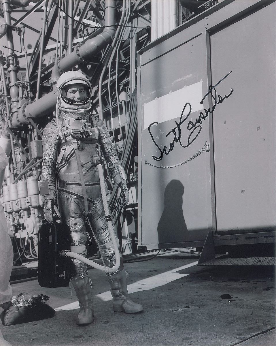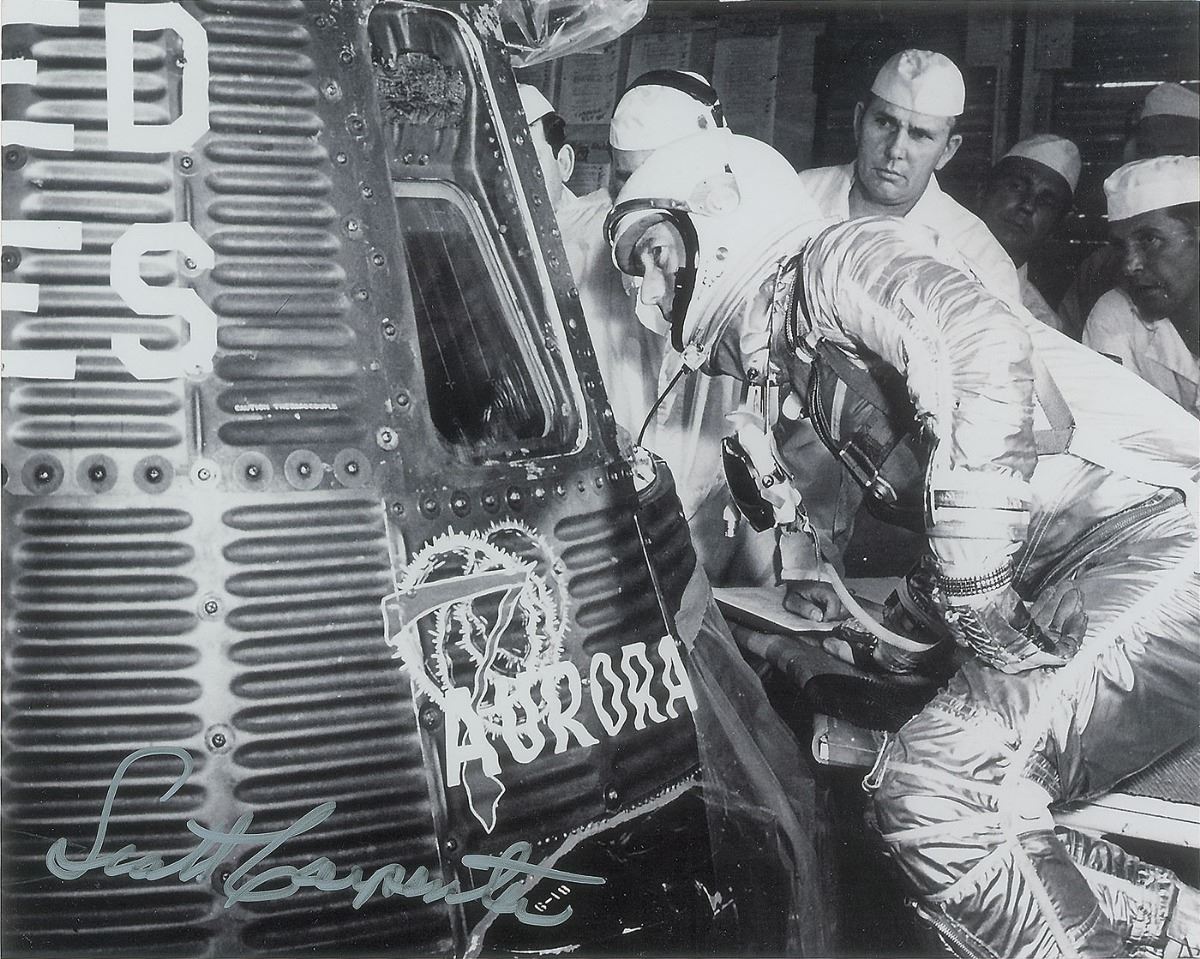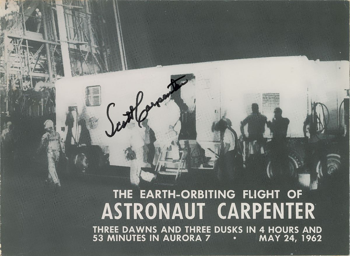 Collection of four items signed by Carpenter, including: a booklet entitled ‘The Earth-Orbiting Flight of Astronaut Carpenter,’ signed in black felt tip; a color glossy 8 x 10 photo of him suiting up, signed in black felt tip; a satin-finish 10 x 8 photo showing Carpenter peering into the Aurora 7, signed in silver ink; and a satin-finish 8 x 10 photo of him during training, signed in black felt tip. In overall fine condition.