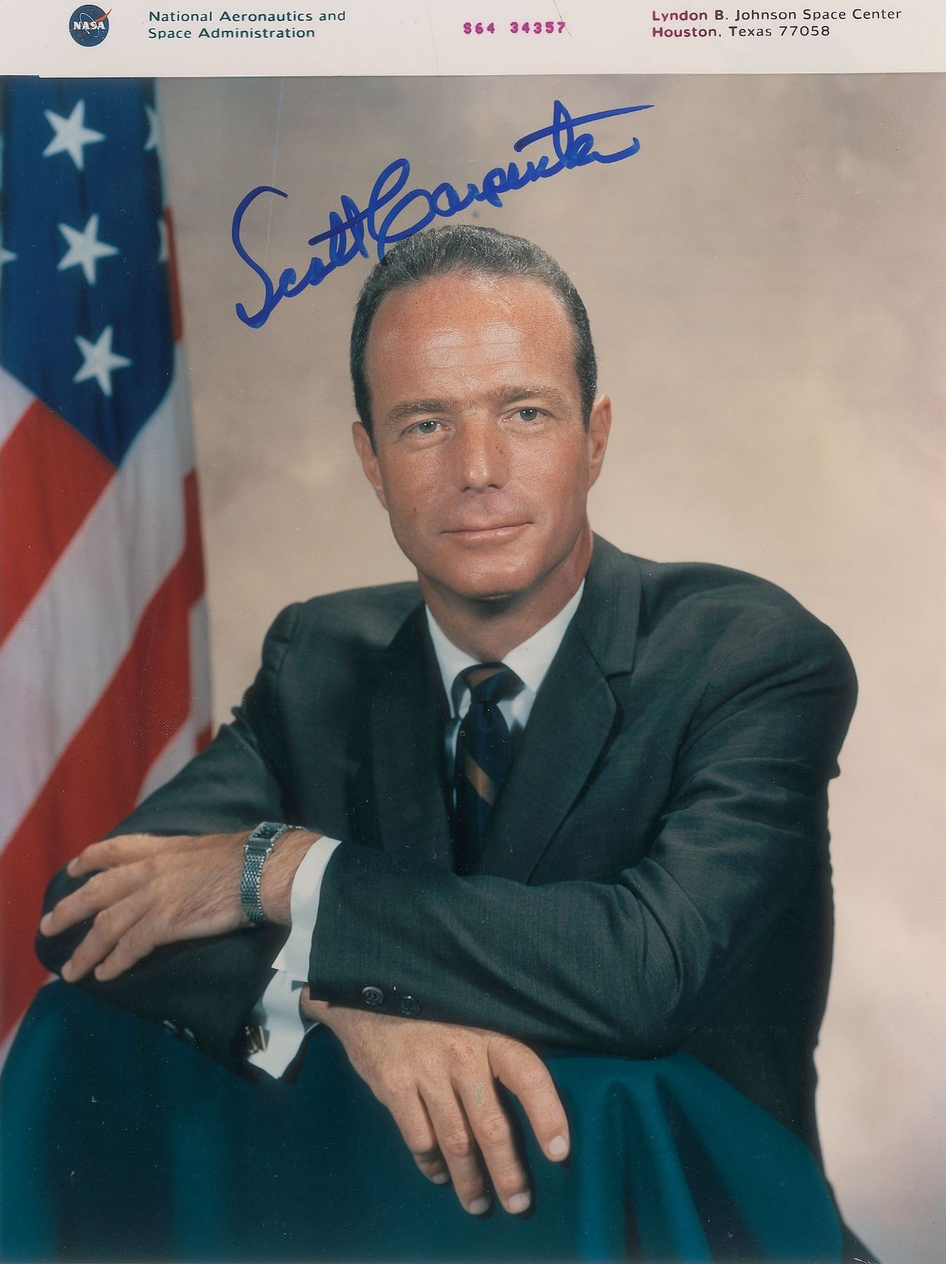 Official color glossy 8 x 10.5 red-numbered NASA photo of Carpenter in formal attire, signed in blue felt tip. Reverse bears black NASA caption text and "Kodak Professional" watermarks. In fine condition.