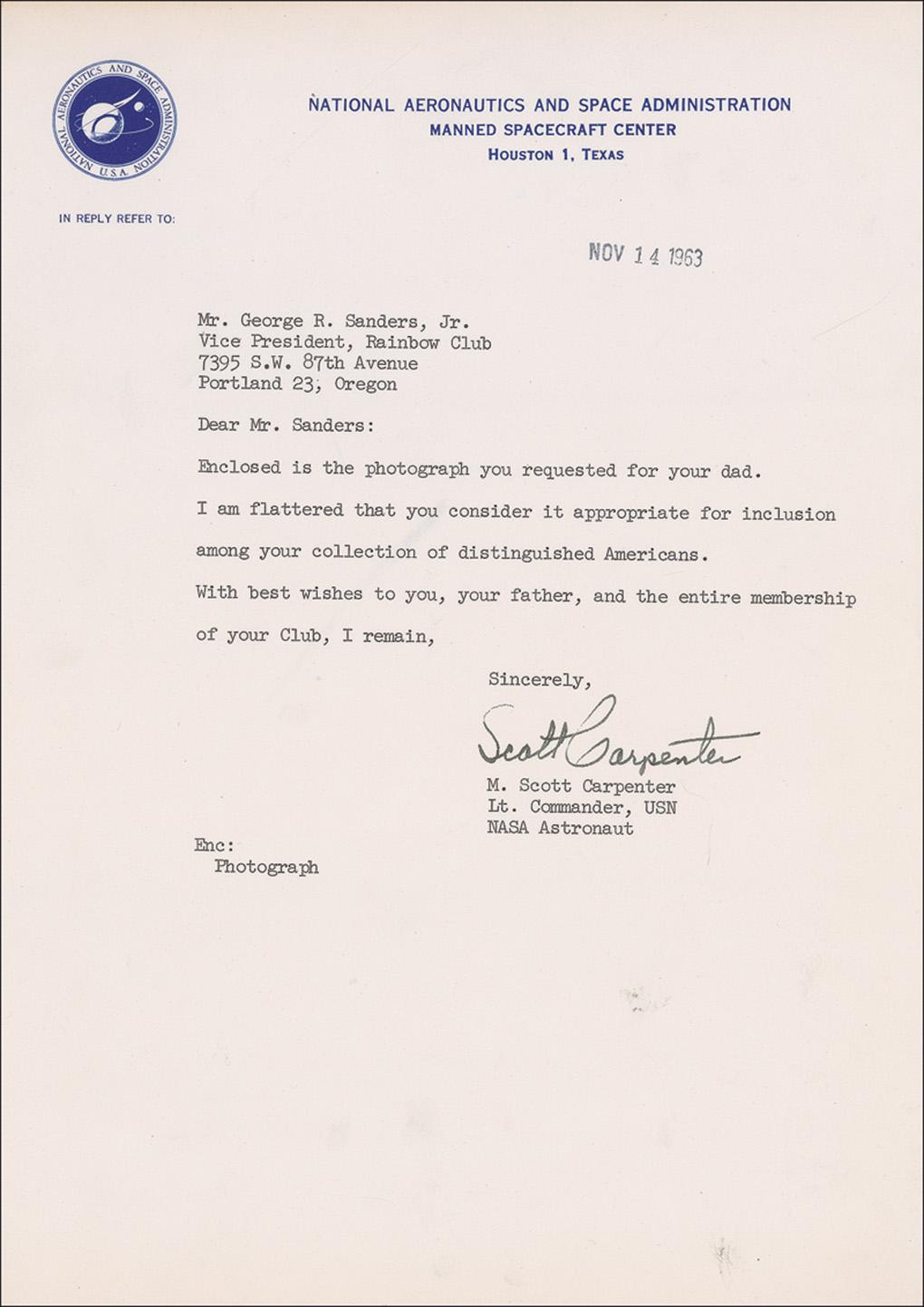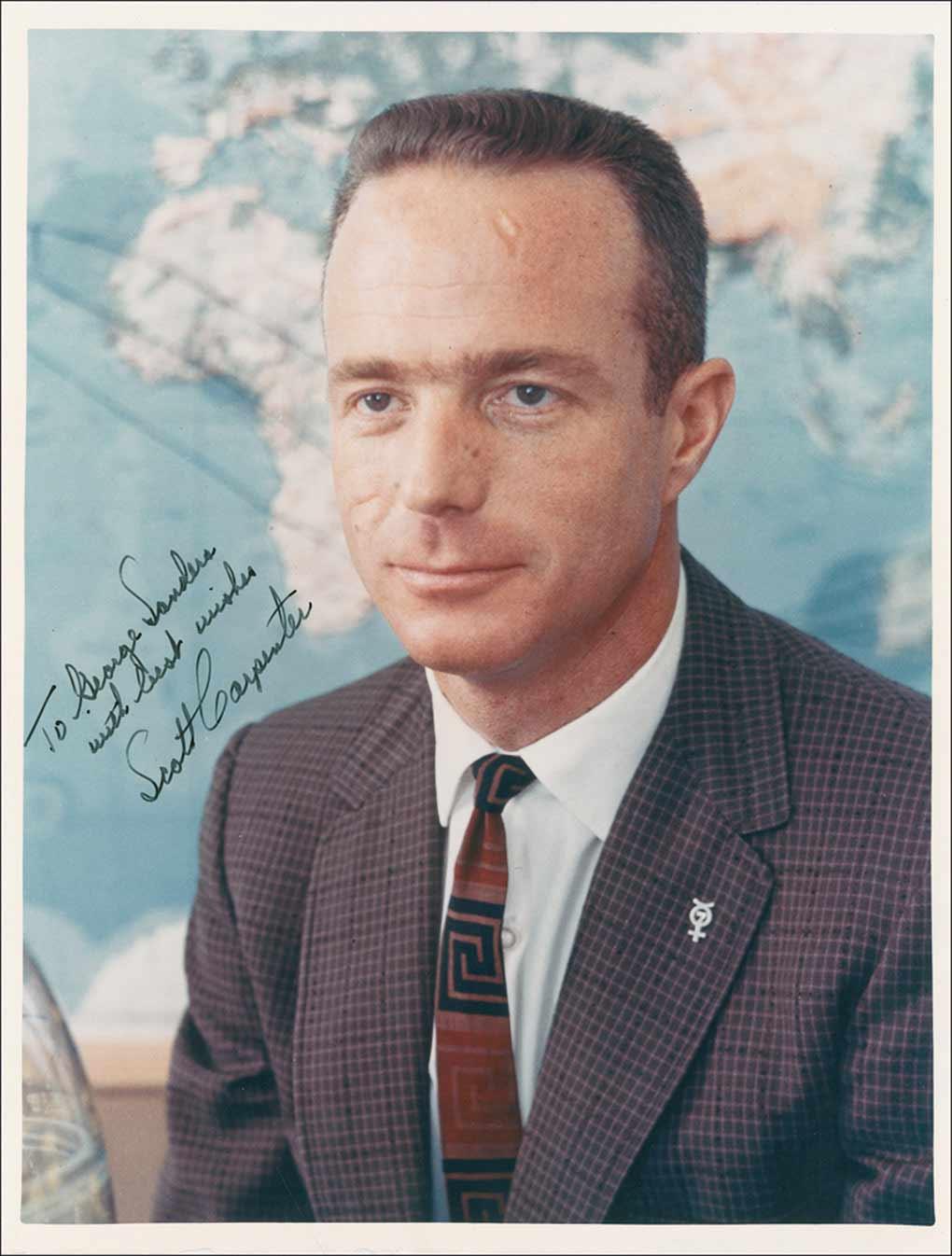 Vintage color glossy 8 x 10 photo, signed and inscribed in black ink “To George Sanders, with best wishes, Scott Carpenter.” Accompanied by a TLS on NASA letterhead, stamp-dated November 14, 1963, signed by Carpenter acknowledging the photo. In fine condition, with a few light horizontal bends and surface impressions to photo.
