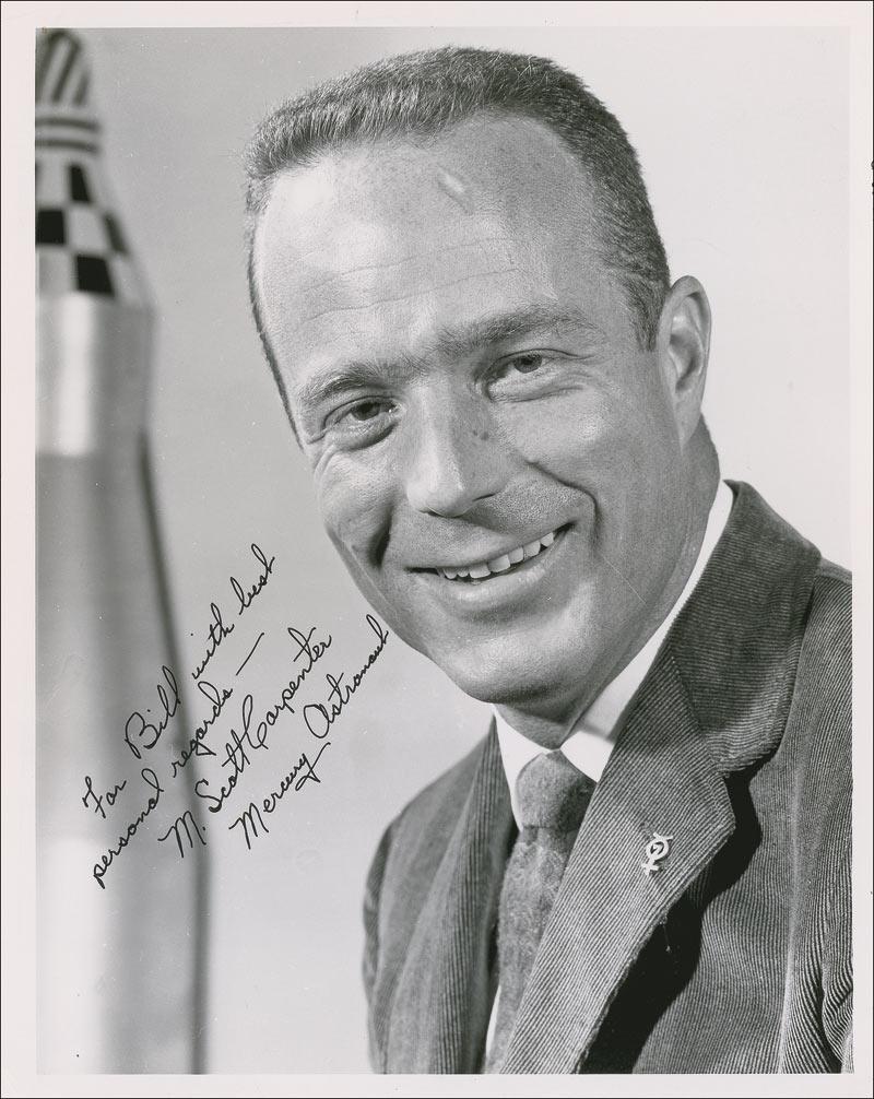 Vintage glossy 8 x 10 NASA photo, signed and inscribed in black ink “For Bill with best personal regards—M. Scott Carpenter, Mercury Astronaut.” In fine condition, with a few scattered light creases and surface marks.