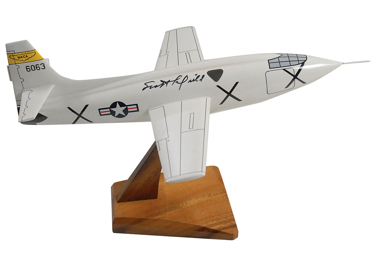 Large composite model of a Bell XS-1 plane, 16.5? long, signed on the body in black felt tip. Model is accompanied by its display stand. In fine condition.