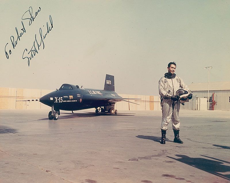 Color glossy 9.25 x 7 photo of Crossfield standing on the tarmac with his X-15 behind him, signed and inscribed in black ink, “To Robert Shaw, Scott Crossfield.” In fine condition, with some scattered surface dings and impressions.