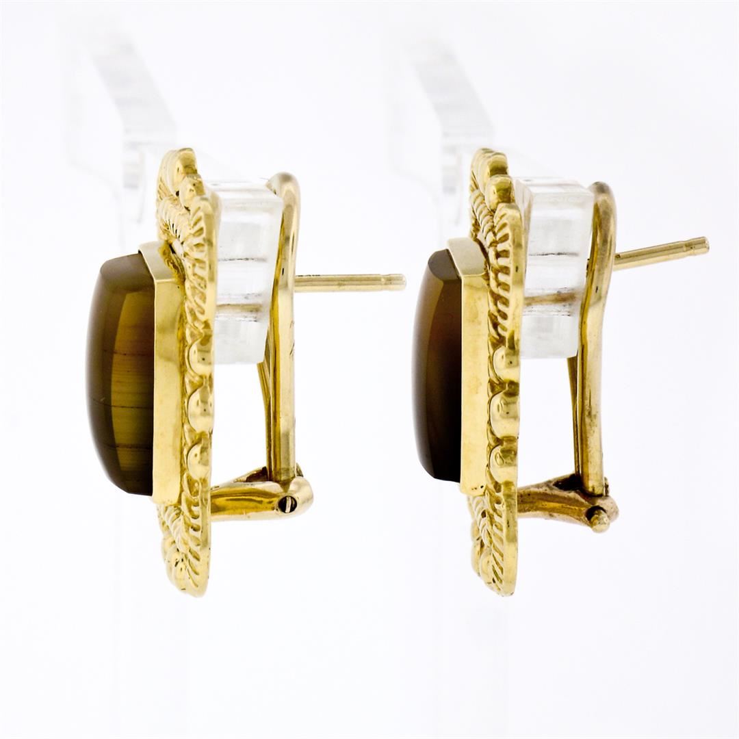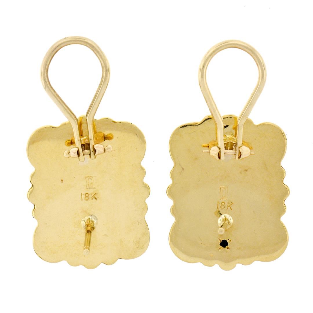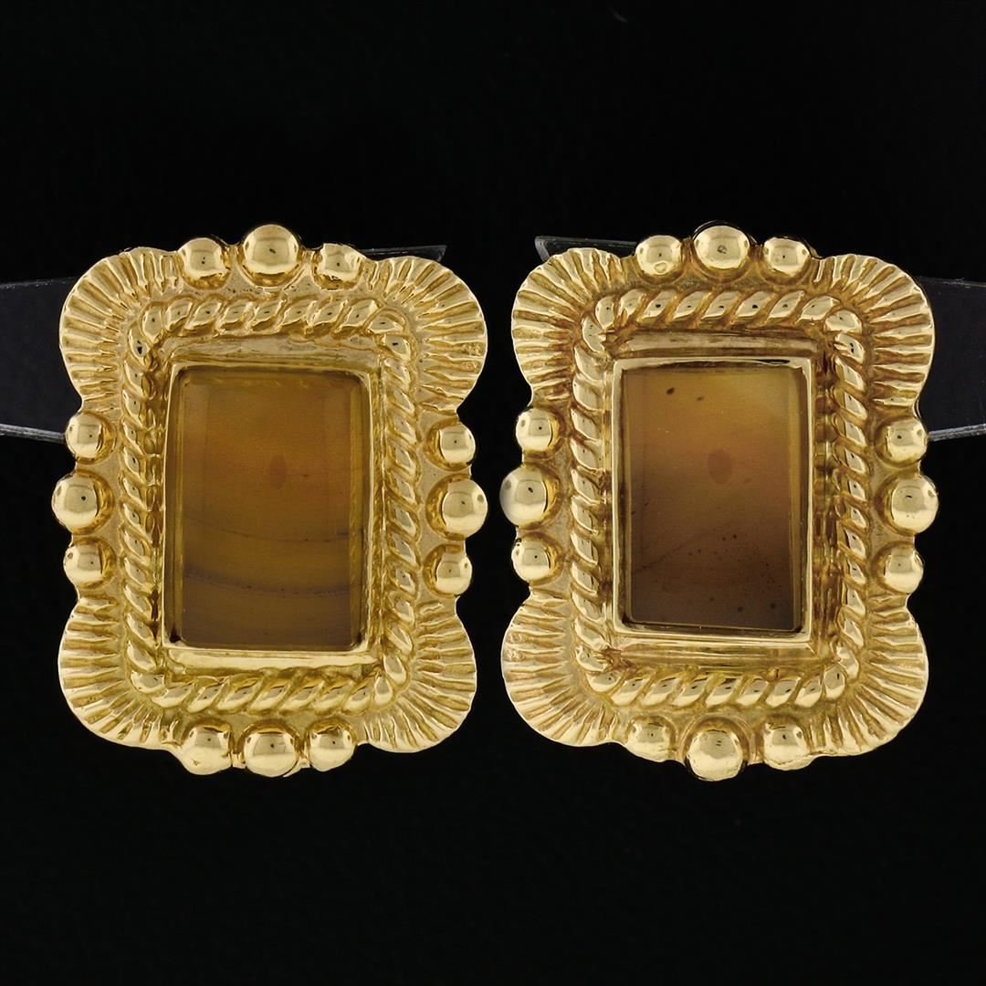 A pair of detailed 18k yellow gold earrings by Scott Gauthier featuring a pair of rectangular cut agates (10.45x6.90mm). The earrings measure approximately 22.50x17.65mm and weigh a total of 13.2 grams.