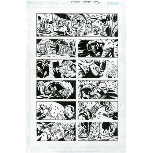 <B>Scott Morse - Bizarro World Complete 12-page Story "Bizarro" Original Art (DC, 2005).</B></I> Eisner-nominated indie creator Scott Morse (<B>Soulwind, Magic Pickle, Ancient Joe</B></I>) contributes his take on Bizarro for the second DC hardback. Characters who make an appearance here include Batman, Robin, the Flash, Omac, Plastic Man, Solomon Grundy, Wonder Woman, and more, all drawn in Morse's inimitable style. The pages have an image area of 9" x 14" and are in Excellent condition.