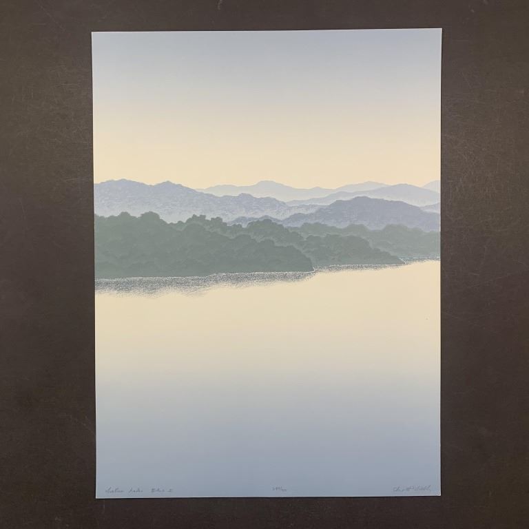 Scott Nellis's "Satin Lake Blue I" limited edition print, signed lower right, numbered 288/300 lower middle, and titled lower left. This piece is of a scene of a body of water in the foreground, and a mountainous tree range in the background. This piece is in excellent condition.