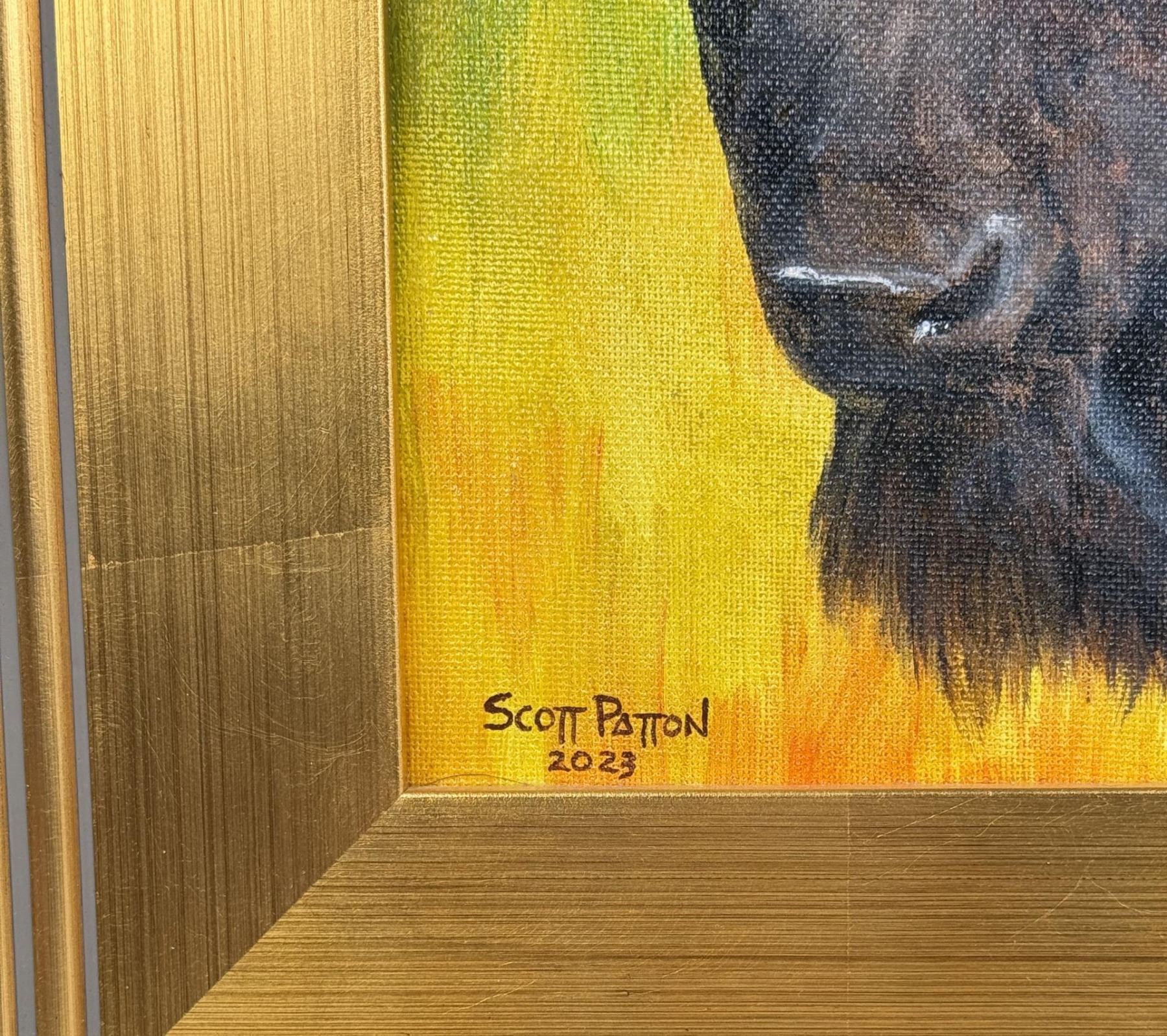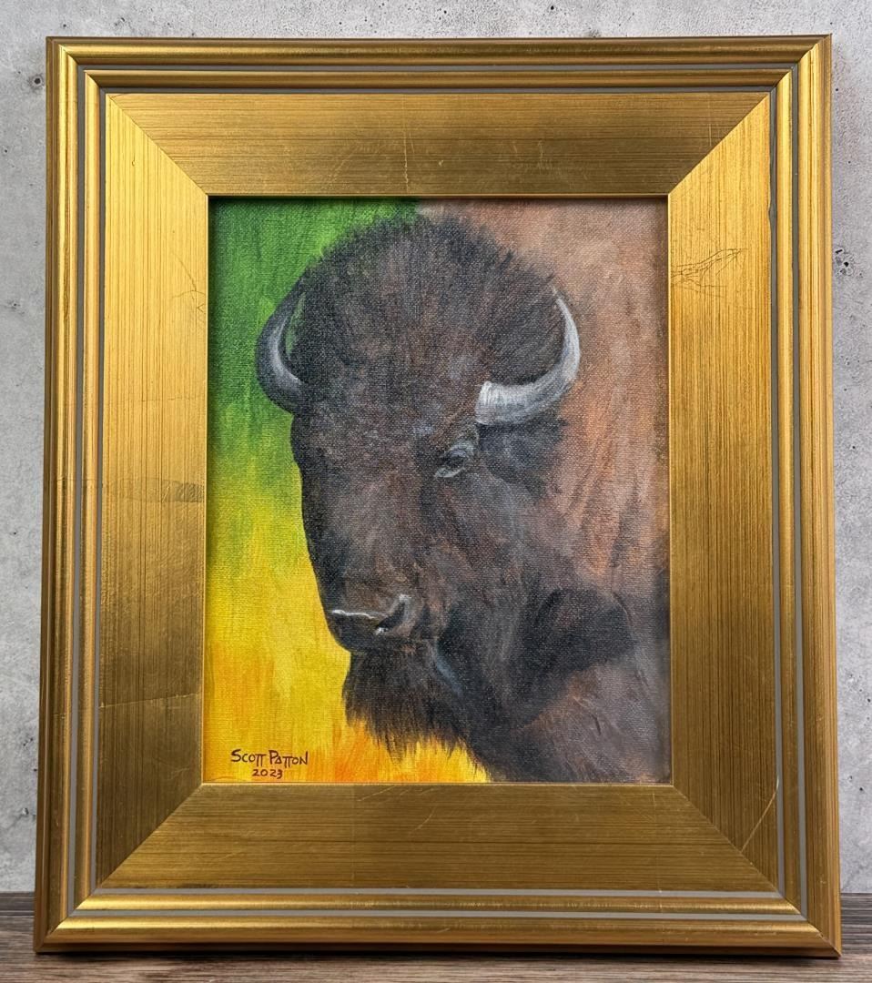 Title is Bull Bison Portrait. 8" by 10" unframed. 13" by 15" framed. Oil on Canvas. Scott Patton is a contemporary impressionist painter whose work is influenced by masters such as Vladimir Volegov and Erin Hanson. Born and raised in Oklahoma, Scott relocated to Florida in 1997 to pursue a career in computer technology, but ultimately found himself drawn back to his true passion art. His natural talent emerged at the early age of seven and has since blossomed into a full-time artistic career. Scott’s style blends modern impressionism with subtle touches of realism, creating vibrant, expressive works that capture both atmosphere and emotion. After exploring various creative paths, he gravitated toward oil painting for its rich textures, extended working time, and exceptional blending properties. Many of the artists who mentored him also specialized in oils, further reinforcing his connection to the medium. His experimental spirit eventually led him to impressionist oil painting, a space where he now thrives. His favorite subjects include nautical and marine scenes, often infused with tropical and figurative elements. Ideally, Scott seeks to combine all of these themes into a single composition, though he also enjoys exploring a variety of subjects to appeal to diverse collectors with a strong emphasis on sailing, beaches, and coastal life. Scott’s goal is not only to enhance the aesthetic of a space but to evoke a lasting emotional connection through storytelling with color and canvas. He currently resides in beautiful Sarasota, Florida, with his wife, Sandra, and their two sons, Aaron and George.