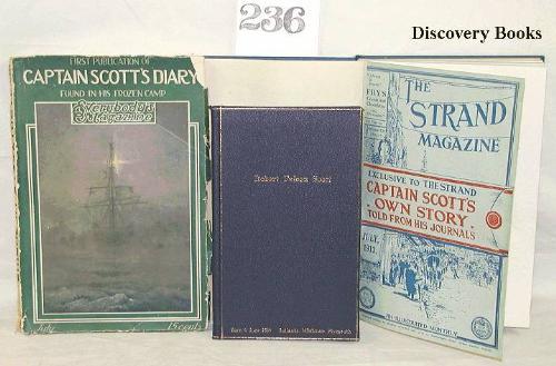 (Scott, Robert F.) TO THE SOUTH POLE. CAPTAIN SCOTT'S OWN STORY TOLD FROM HIS JOURNALS. Extracted from four issues of The Strand Magazine, London, July-October, 1913, totaling over 80pp. Many, many illus from Ponting's photos. The four complete, separate articles bound together in cloth, the original front wrapper of each issue bound in. Several sm. marginal rubber library stamps, else very good……. with ….. THE UTTERMOST SOUTH. THE UNDYING STORY OF CAPTAIN SCOTT. In: Everybody's Magazine, July, 1913 issue. Part one only of (?). Complete issue, good…….with ……. CAPTAIN ROBERT FALCON SCOTT R.N. by L. M. Forbes. 16 unnumbered pp. 6 illus. Bound in gilt stamped blue morocco. No date. A souvenir for the opening of a new wing at Scott Polar Research Inst.