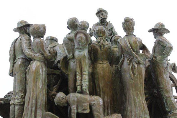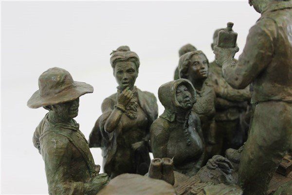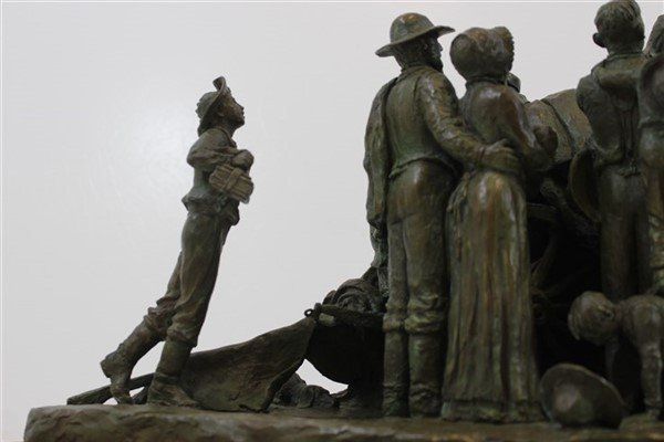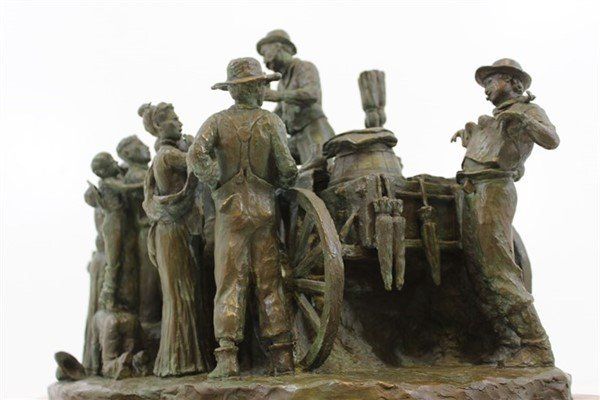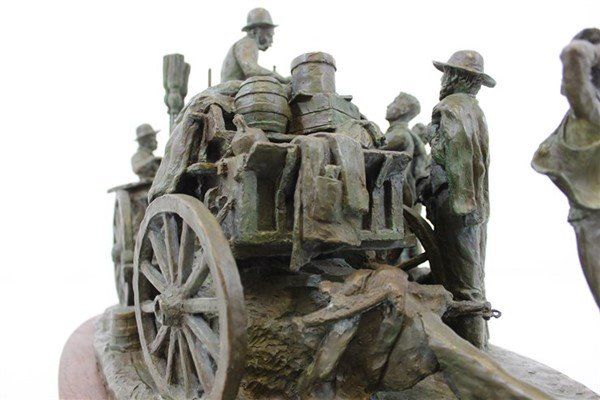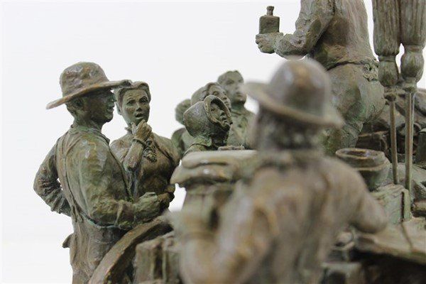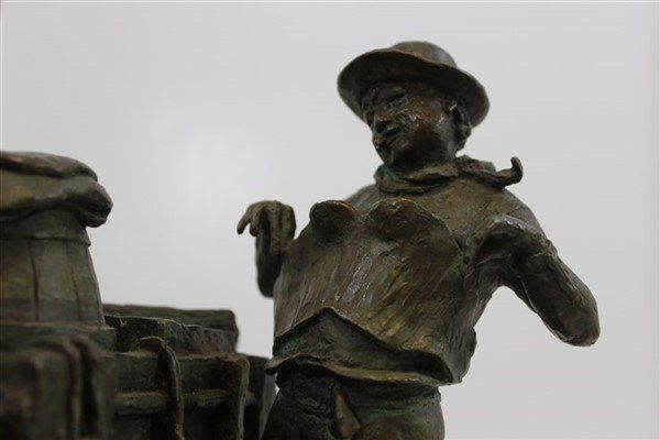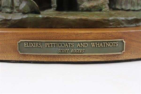 number 5/30, rendering of a old west medicine man selling to a crowd, mounted on a wooden base with turn table, approx 30" wide x 15" tall x 15" deep