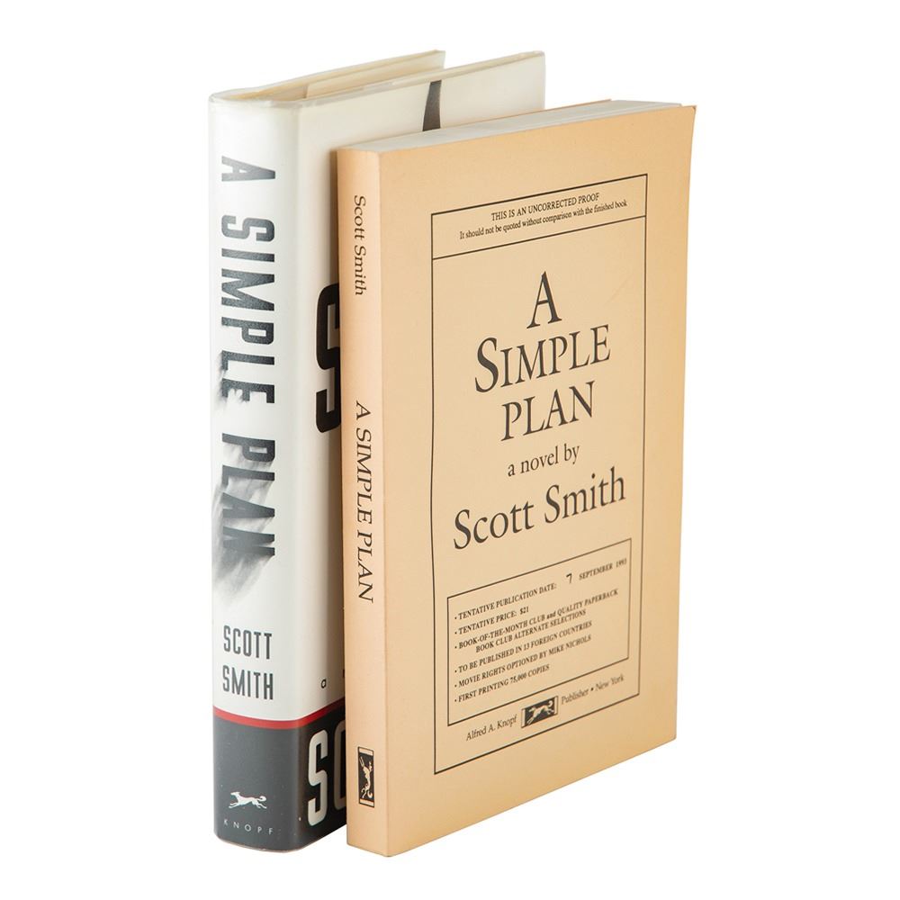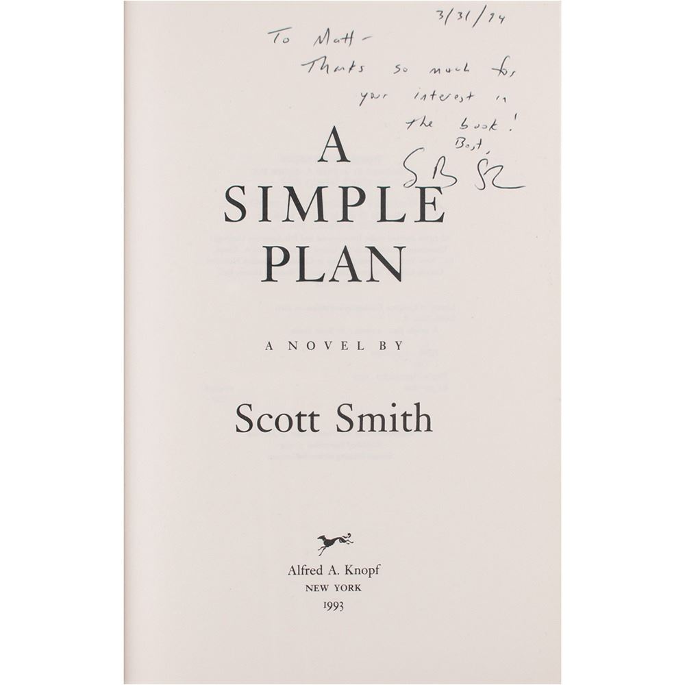 Three items: a first edition (review copy) of A Simple Plan, published by Alfred A. Knopf in 1993, hardcover with dust jacket, signed and inscribed on the title page in black ballpoint, "To Matt—Thanks so much for your interest in the book! Best, S. B. Smith, 3/31/94"; an uncorrected proof copy of A Simple Plan listing a "Tentative Publication Date: 7 September 1993," bound in plain tan wraps, signed and inscribed on the title page in black ballpoint, "To Matt—With all kind wishes, Best, S. B. Smith, 3/31/94"; and a one-page TLS signed "S. Smith," dated February 27, 1994, addressed to Mr. Stiller: "I wanted to thank you for your kind note about my novel, A Simple Plan. I'd be flattered to sign your copy of the book." Smith adds a brief handwritten postscript: "Let me know if you want an inscription, too. —S." In overall fine condition. Accompanied by the original hand-addressed mailing envelope, with Smith incorporating his signature into the return address field.