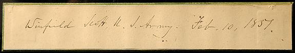 Scott, Winfield. Signature on a 1 x 6" slip of paper with "U.S. Army, Feb. 10, 1857," n.p. Fine. Matted with a portrait of Scott and framed to an overall size of 12 x 11¼".