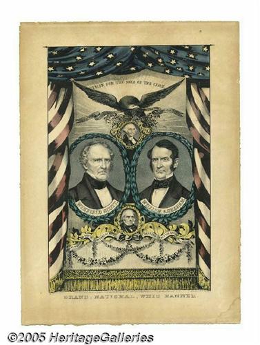 <B>Scott and Graham Grand National Banner Lithograph</B></I> This desirable Nathaniel Currier small folio lithograph was issued for the presidential election of 1852. It features the last Whig ticket, Winfield Scott and William A. Graham. It measures a bountiful 11" x 15" and is titled "Grand, National, Whig Banner." George Washington and Henry Clay are also depicted, along with an Americana eagle, the names of Scott's victorious battles and the slogan "Union For The Sake Of Union." (That slogan also utilized in 1840 for William Henry Harrison.) Bright colors and lightly toned, this is a great display piece for a candidate whose effort generated little in the way of campaign items. There are no tears or restoration and it remains a lovely example. Lot:256