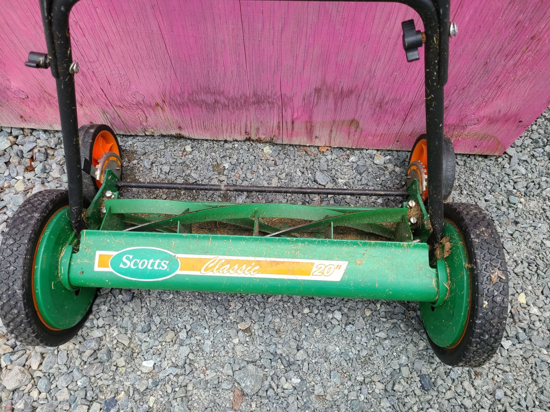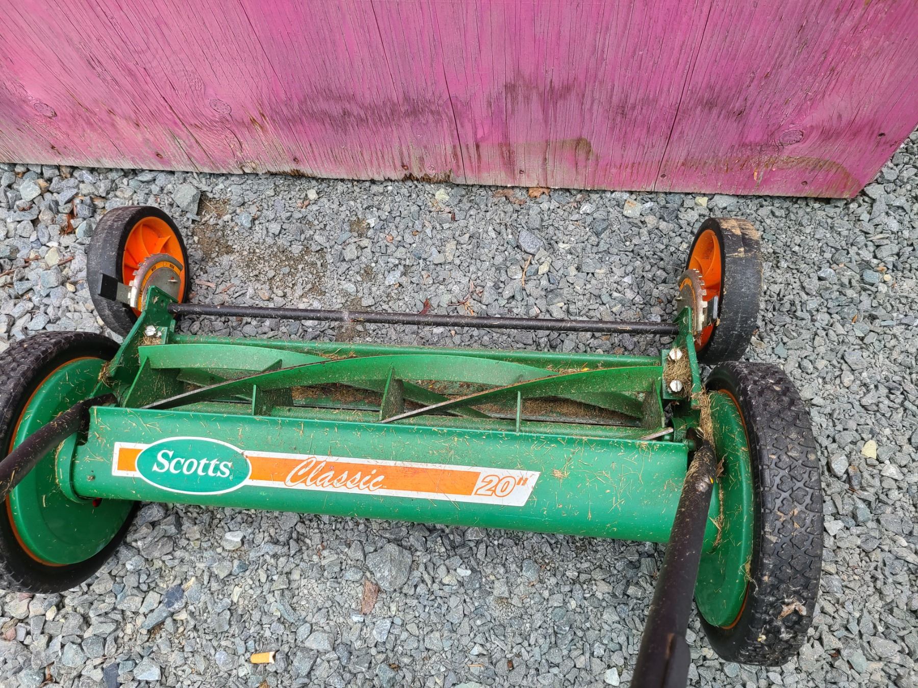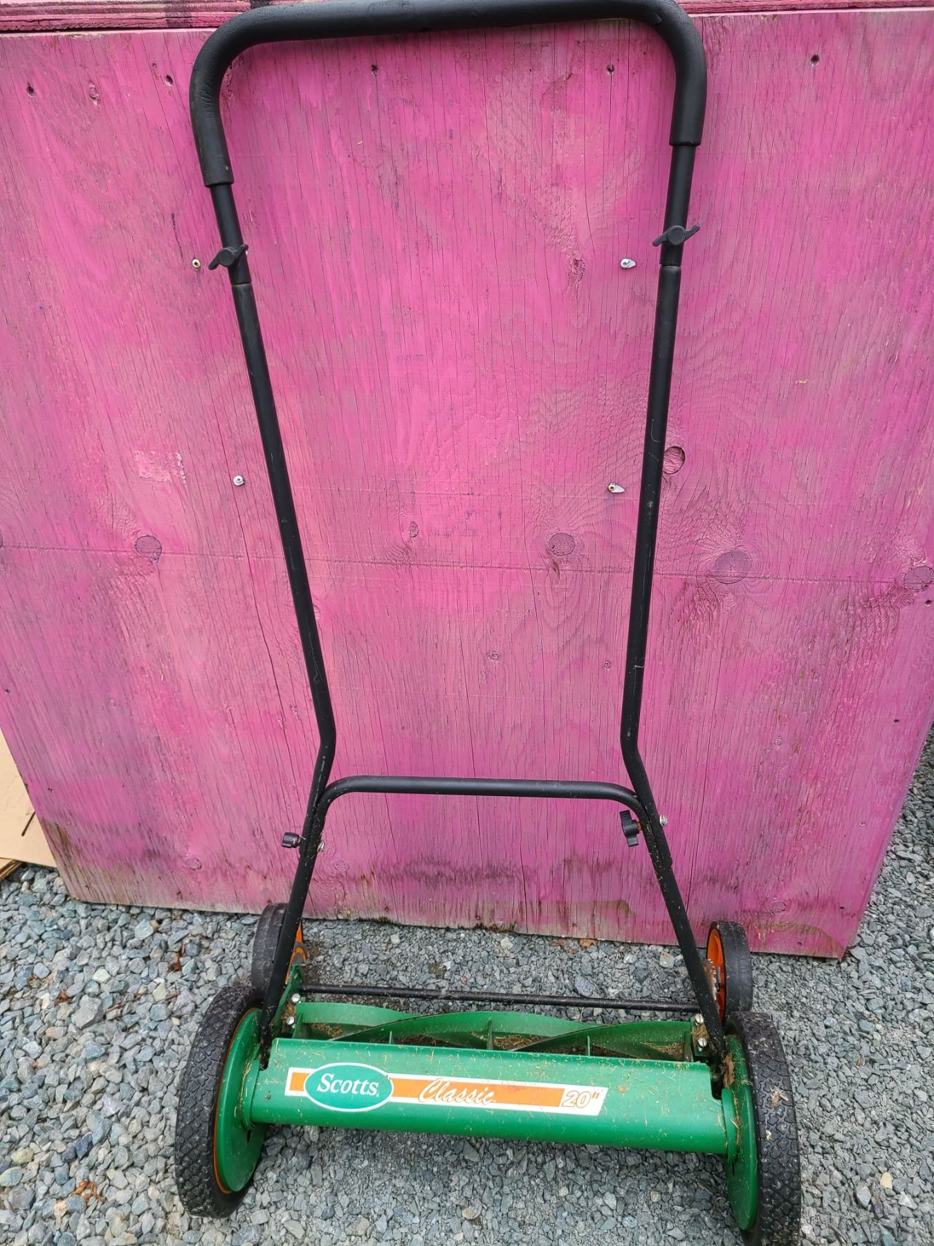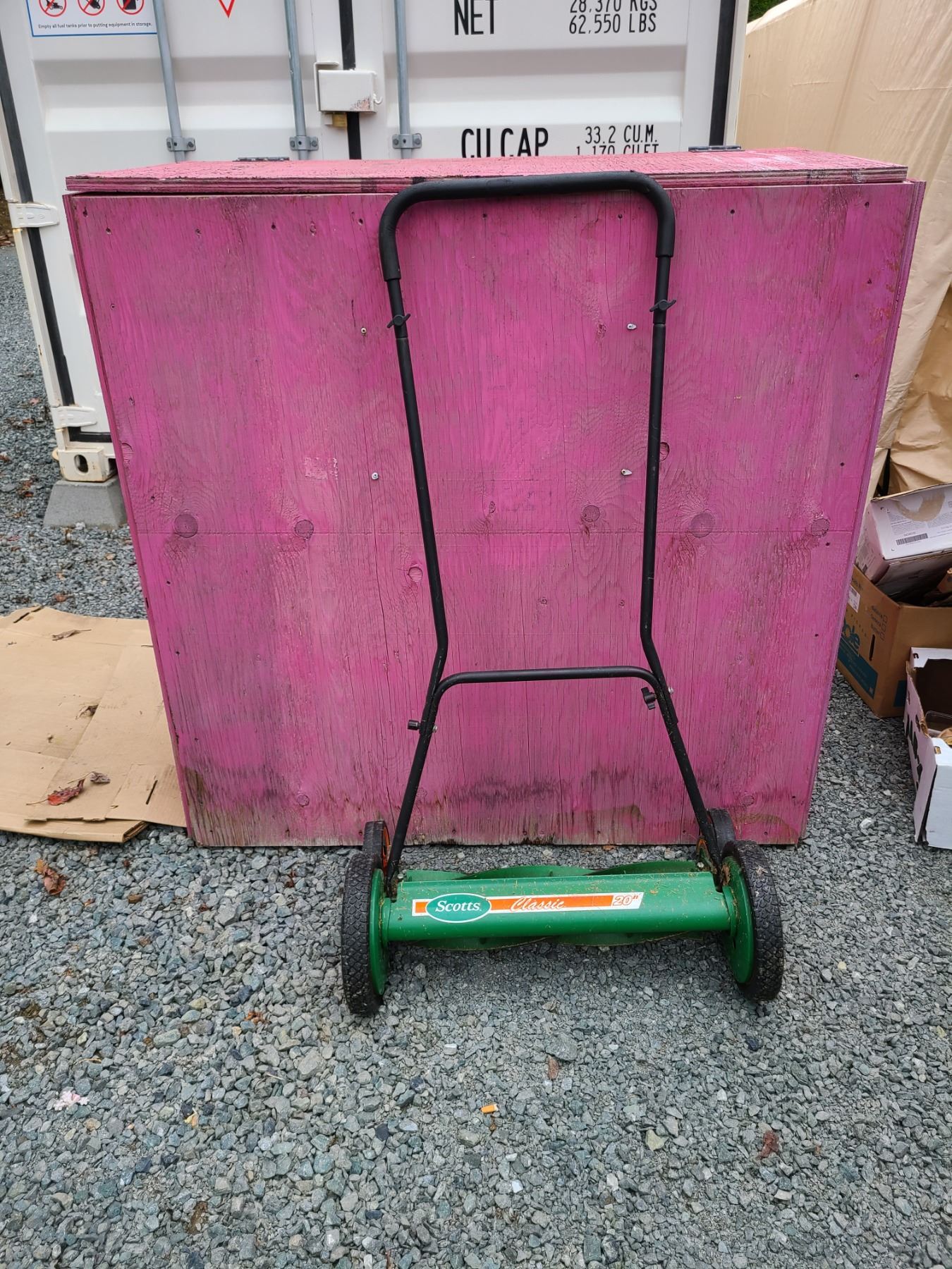 Scott’s push lawnmower and large wooden storage box. Bring help to move and pick up at 9am