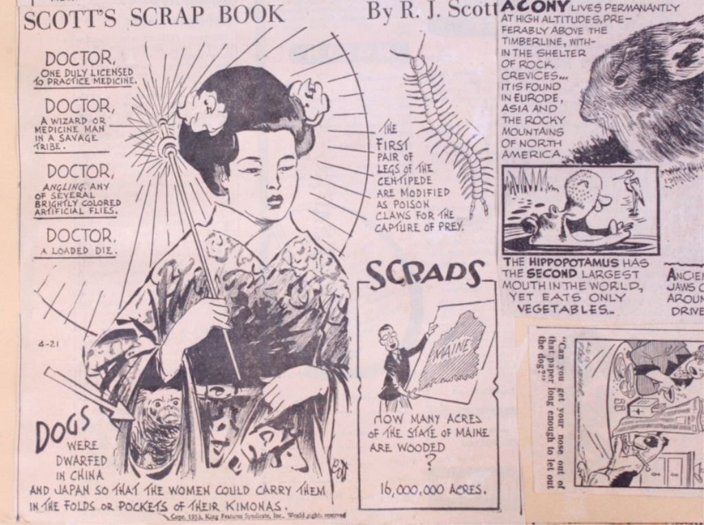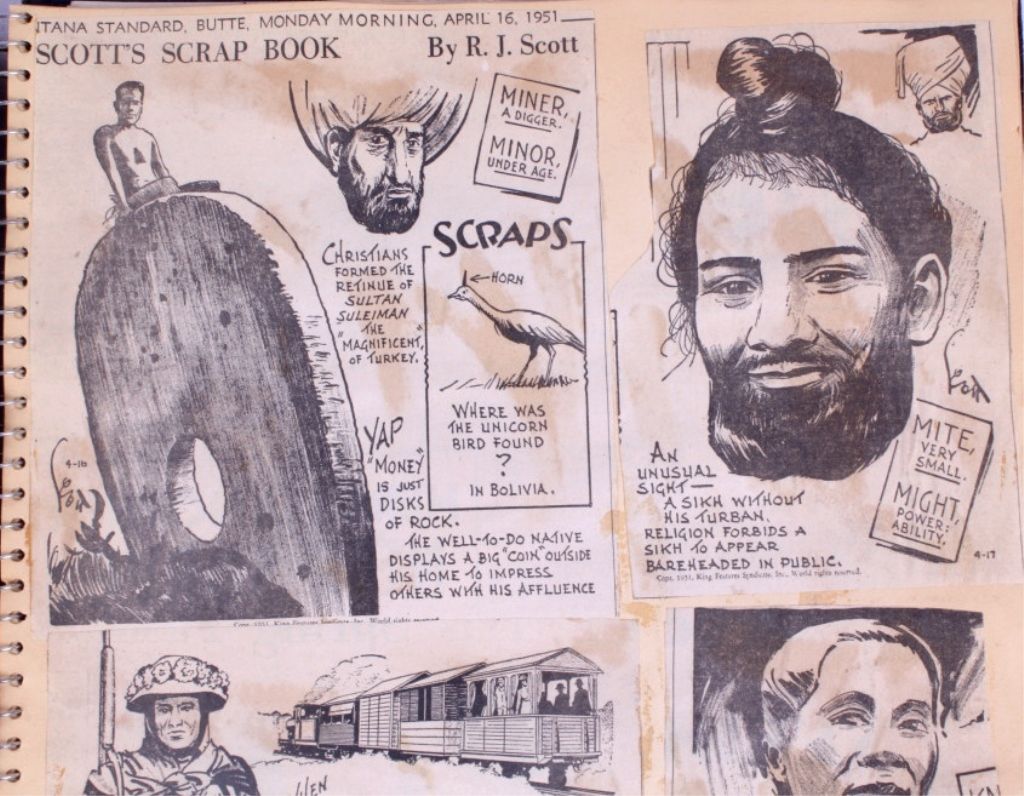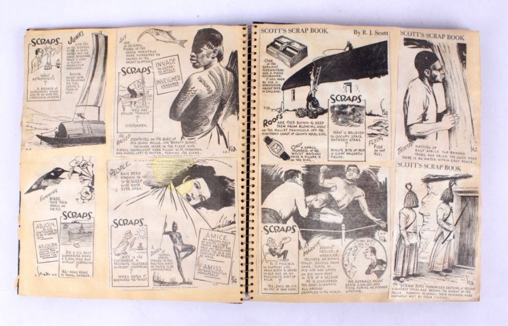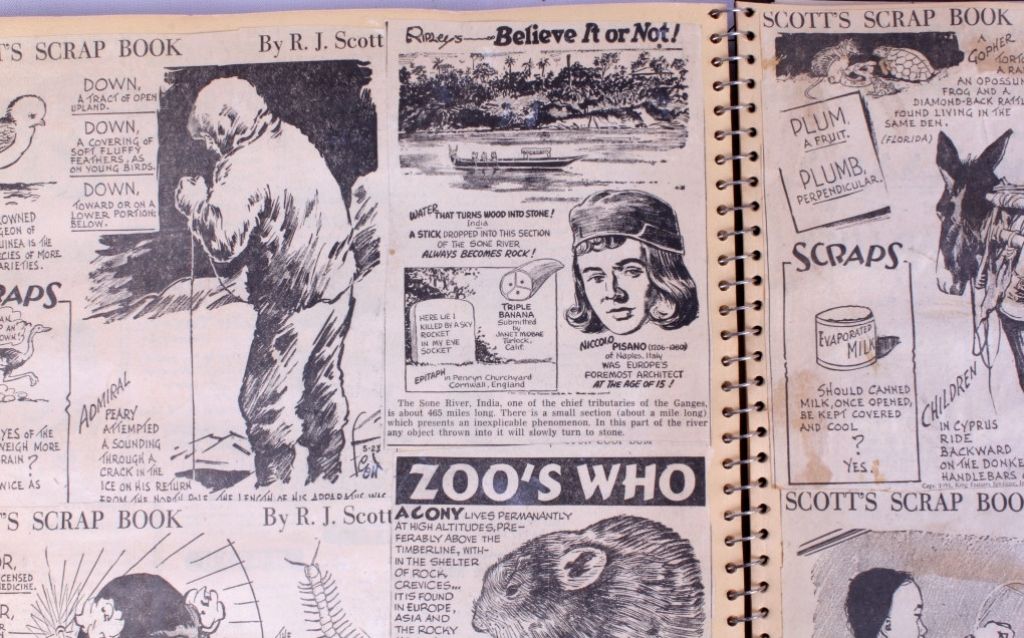 This lot features an album filled with clippings of "Scott's Scrap Book". This column was put out in the 1950's by R.J. Scott, and was carried by at least one publication. The subject matter of quirky andinteresting facts appealed to a collector who preserved them in this book. The book measures 11" x 13".
