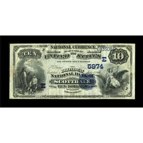 <B>Scottdale, PA</B></I> - $10 1882 Date Back Fr. 545 <B>The Broadway NB</B></I> Ch. # (E)5974<BR> Bright colors and plenty of embossing are noticed on only the second Date Back reported from here. <B>Very Fine</B></I>.<BR><BR><b>Shipping:</b> Coins & Currency (<a target="_blank" href="http://www.heritageauctions.com/common/shipping.php">view shipping information</a>)