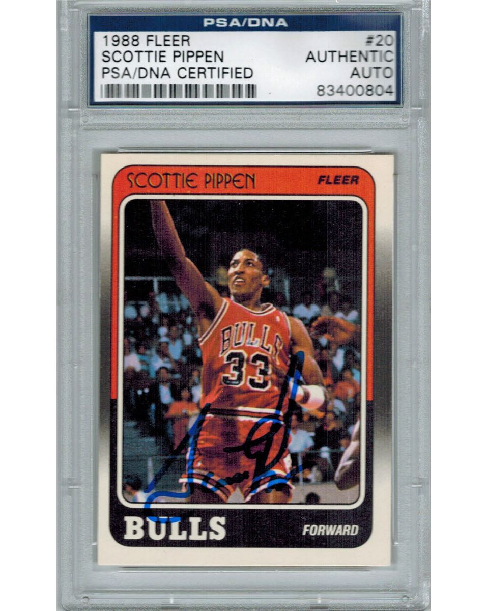 Scottie Pippen signed 1988 Fleer Chicago Bulls rookie card #20. The card has been authenticated and slabbed by PSA/DNA and the number can be verified online. Authenticated and autographed Rookie cards are hard to come by and are an increasingly rare and valuable collectible.