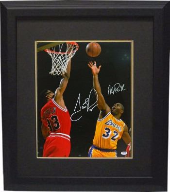 Magic Johnson was selected first overall in the 1979 NBA Draft by the Lakers. He won a championship and an NBA Finals Most Valuable Player Award in his rookie season, and won four more championships with the Lakers during the 1980s. Johnson's career achievements include three NBA MVP Awards, nine NBA Finals appearances, twelve All-Star games, and ten All-NBA First and Second Team nominations. Scottie Pippen, along with Michael Jordan, played an important role in transforming the Bulls team into a vehicle for popularizing the NBA around the world during the 1990s. Considered one of the best small forwards of all time, Pippen was named to the NBA All-Defensive First Team eight times and the All-NBA First Team three times. He was a seven-time NBA All Star and was the NBA All-Star Game MVP in 1994. He was named one of the 50 Greatest Players in NBA History during the 1996–97 season, and is one of four players to have his jersey retired by the Chicago Bulls.Magic Johnson and Scottie Pippen have hand signed this Los Angeles Lakers/Chicago Bulls 16x20 Photo. PSA Hologram and Certificate of Authenticity. Custom Black Mat and Black Framed as shown.