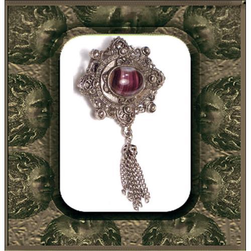 This 3? long etruscan brooch is really a beautiful piece that can be worn with casual or evening clothes because it carries an old world charm with it. This has a rich purple striped agate stone that gives this a lot of charm. In great shape this is really lovely!