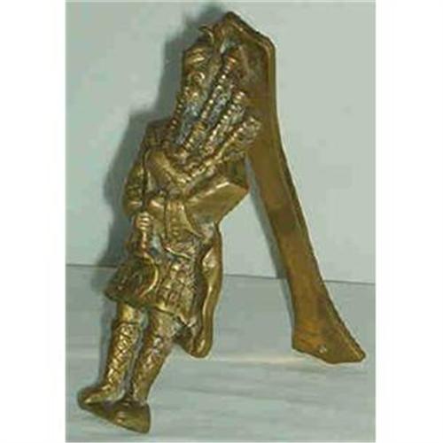A Scottish Piper. in full dress. Great detail. Needs a good soak to loosen old brass polish. Two screwholes to attach to door. Victorian cast brass.