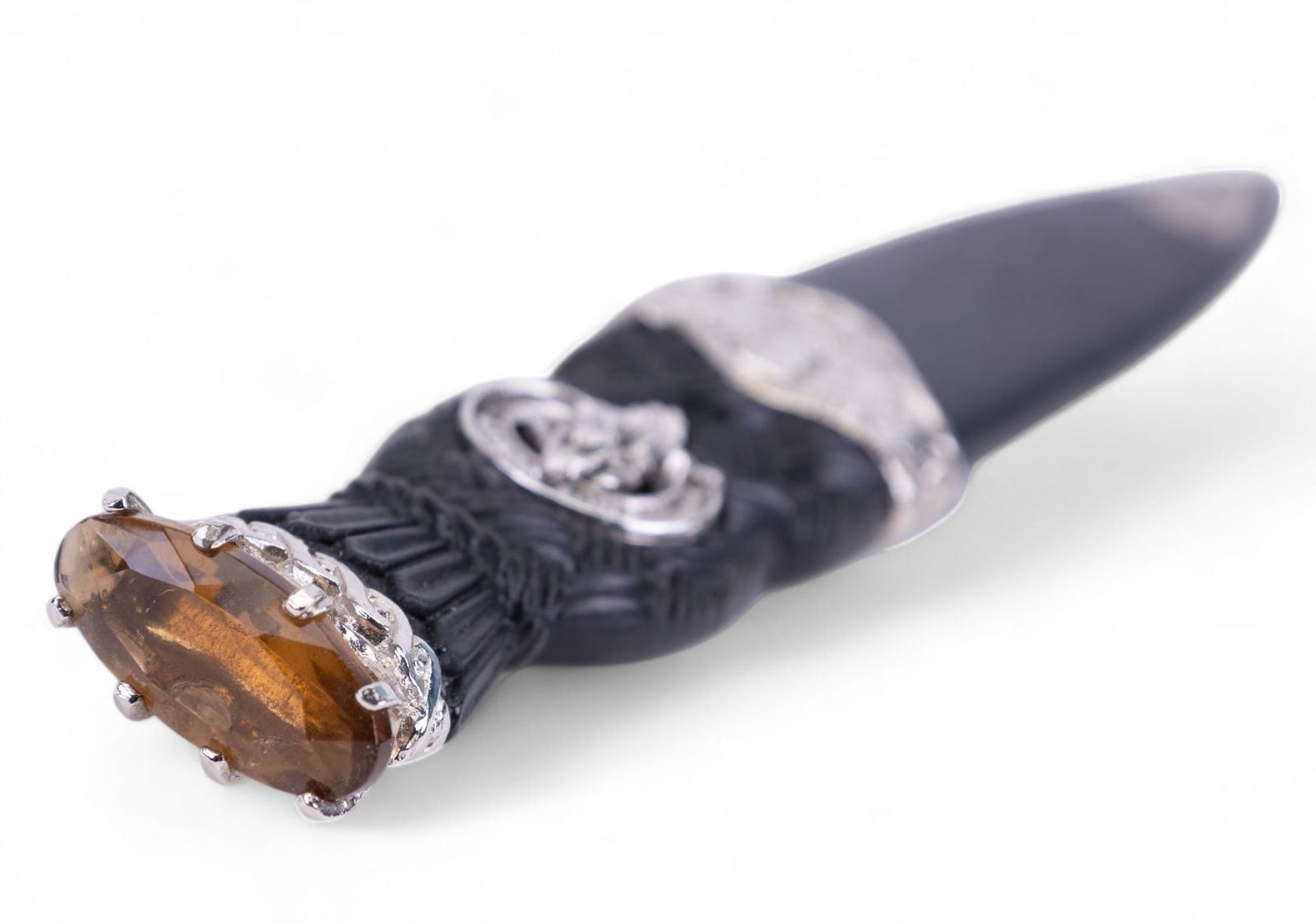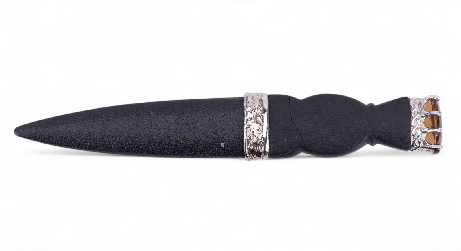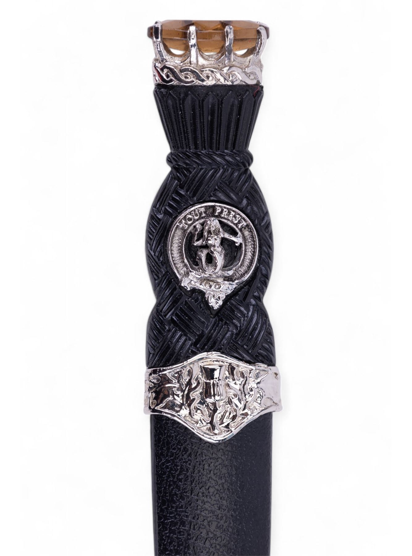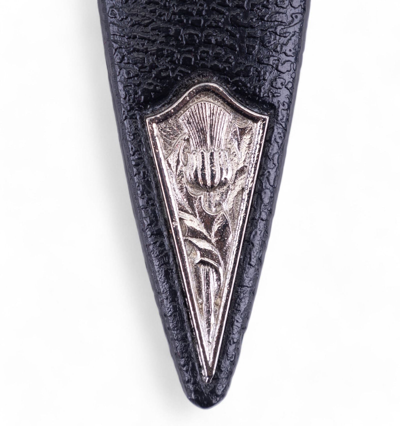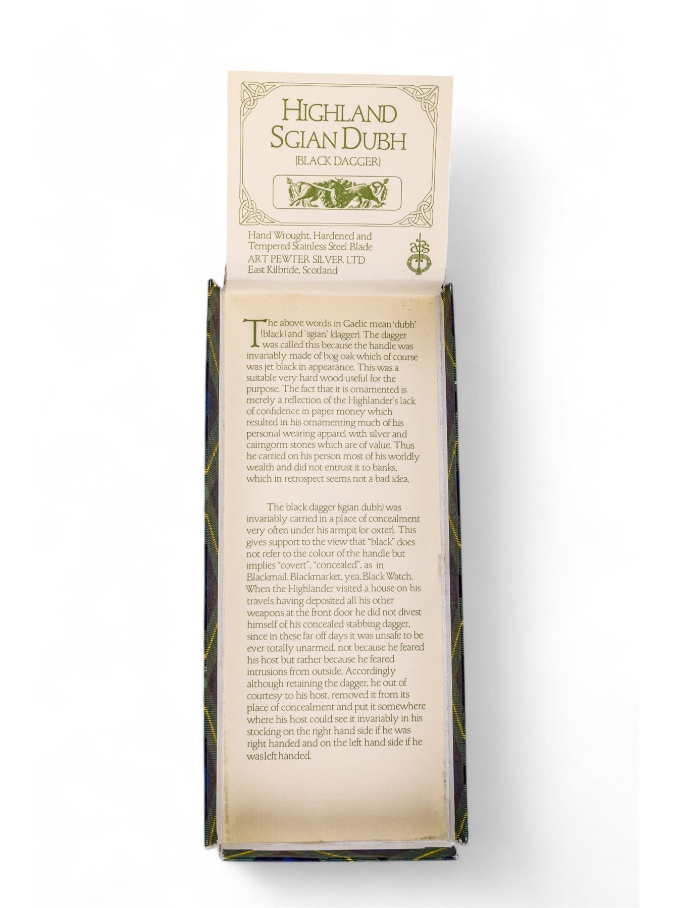 Scottish Highland Sgian Dubh (Black Dagger) manufactured by Art Pewter Silver Ltd. in East Kilbride, Scotland. Item is hand wrought, hardened, & made w/ a tempered stainless steel blade. Dagger measures approx. 7.25" long & comes in original box w/ a description of the dagger & its origin.