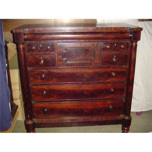 This is a desirable 1850 Scottish gentleman chest with column support and flamed mahogany. The chest has three drawers on the bottom and two small drawers in the left and one deep drawer on the right.