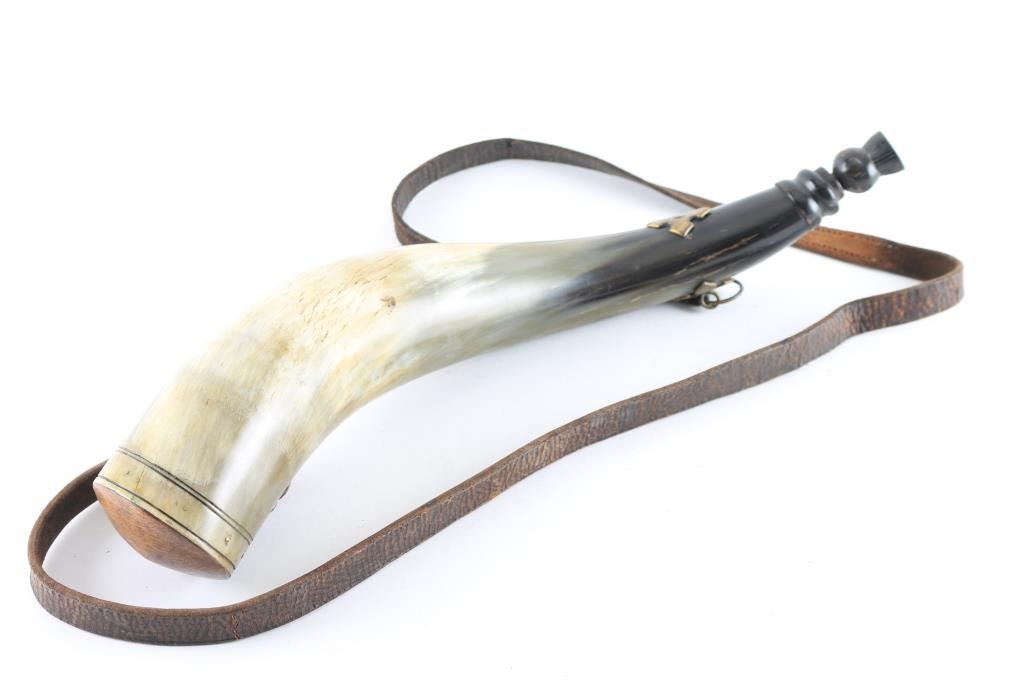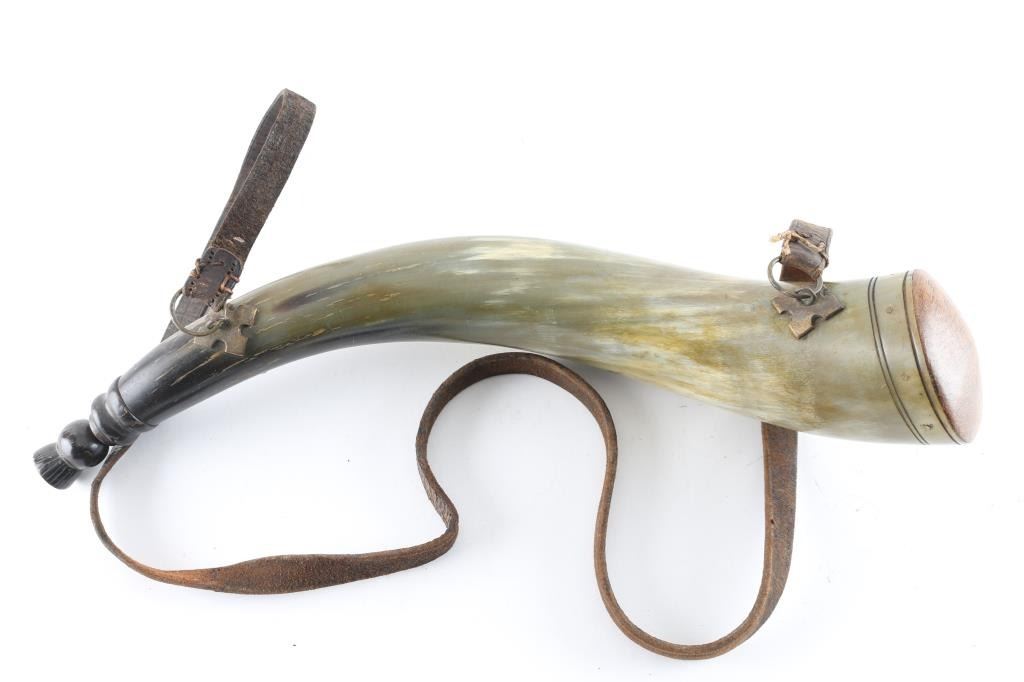 circa 18th to 19th century. Approximately 21" from tip to butt. Original spout plug is carved thistle and brass Celtic crosses are attached one to each hanger and one near the end of spout at center. Period strap and brass or brass allow rings. Old cord attaches to plug and near fine condition with light cleaning overall. Just the type that would have been carried by Scott's Regiments who served in America during both Revolutionary War and War of 1812.
