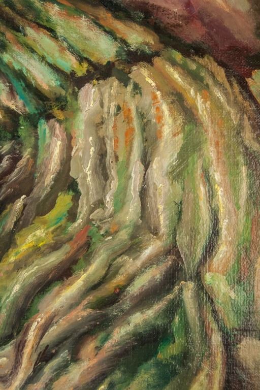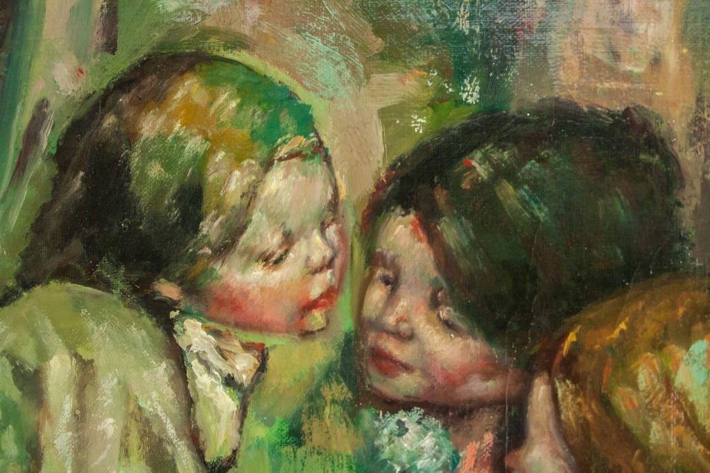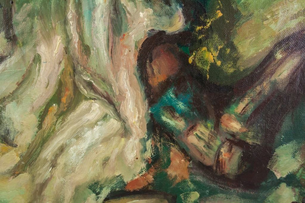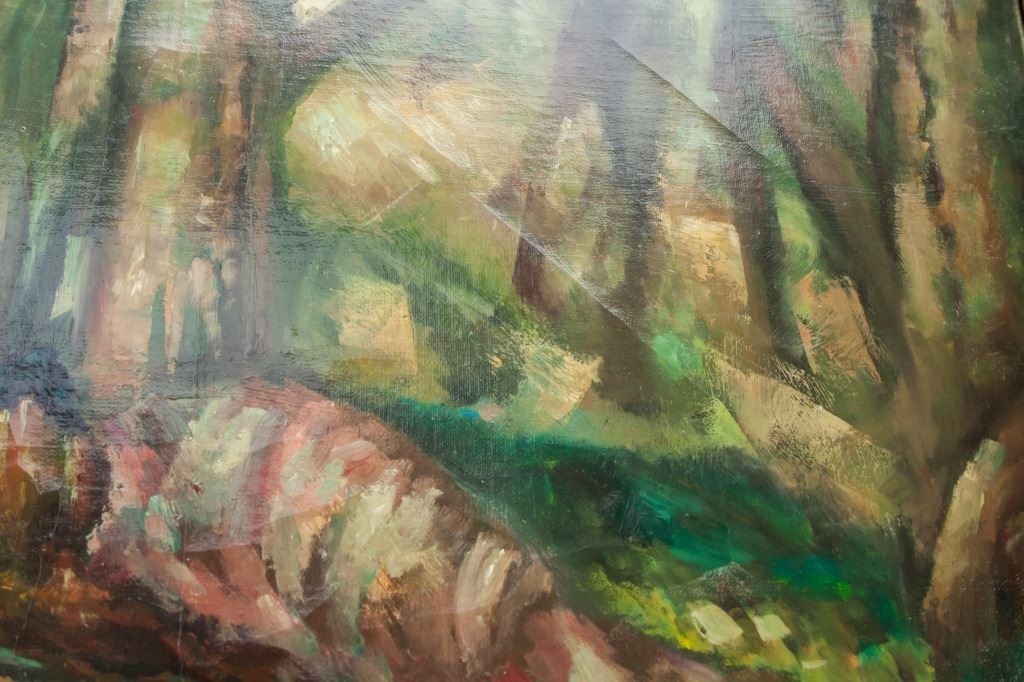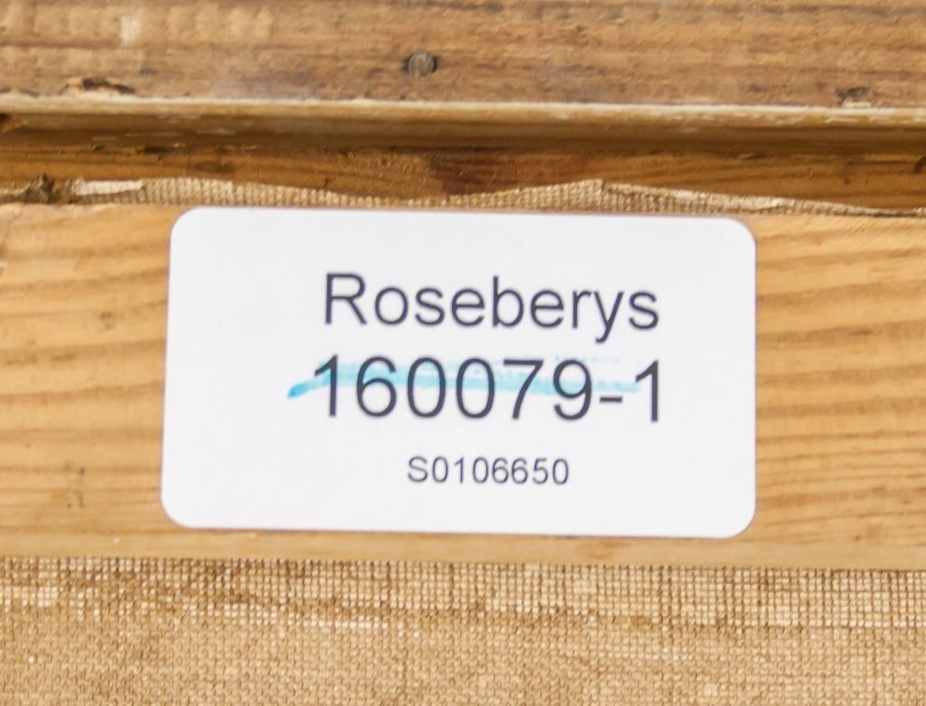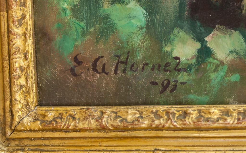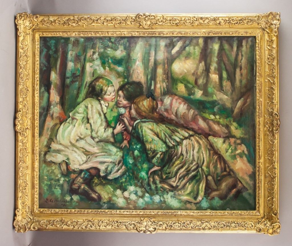 Oil on canvas, framed. Featuring three girls in a forest, gathering around a flower. Signed "E. A. Hornel" to the bottom left corner, with "93" inscribed beneath the signature. Label on verso reads "Roseberys 160079-1 S0106650". Canvas size: 63 x 79 cm (24.75 x 31.25 inches). Frame size: 79 x 96 cm (31.25 x 37.75 inches).