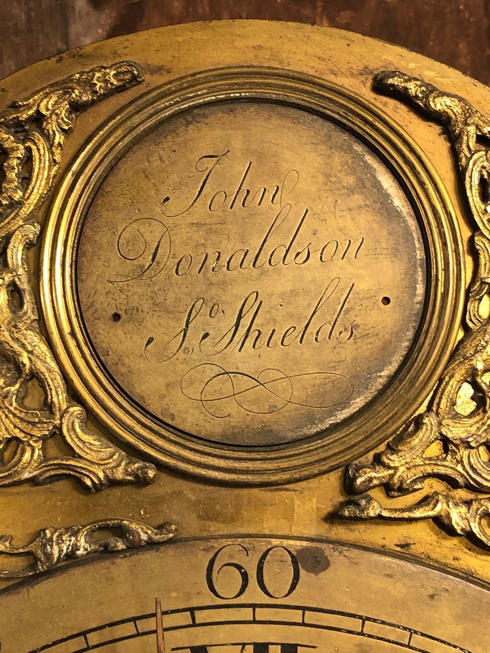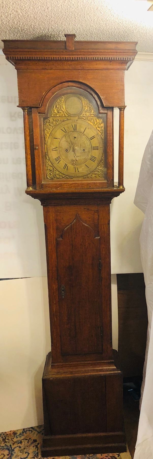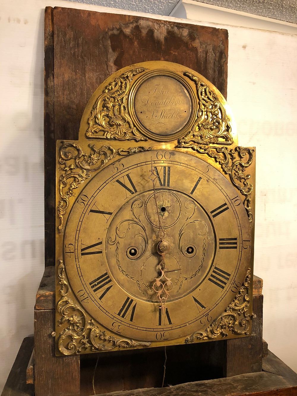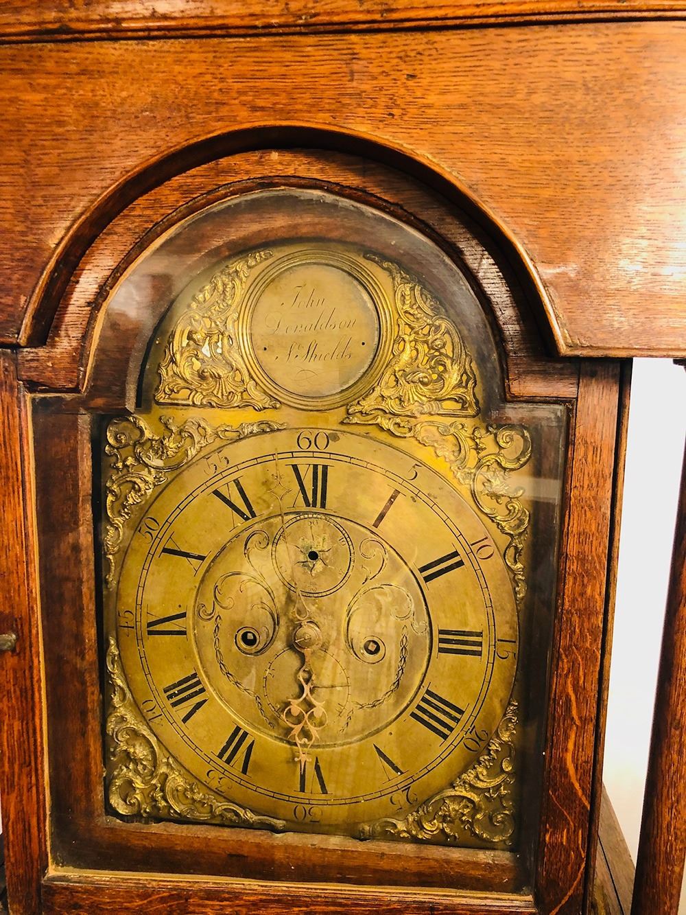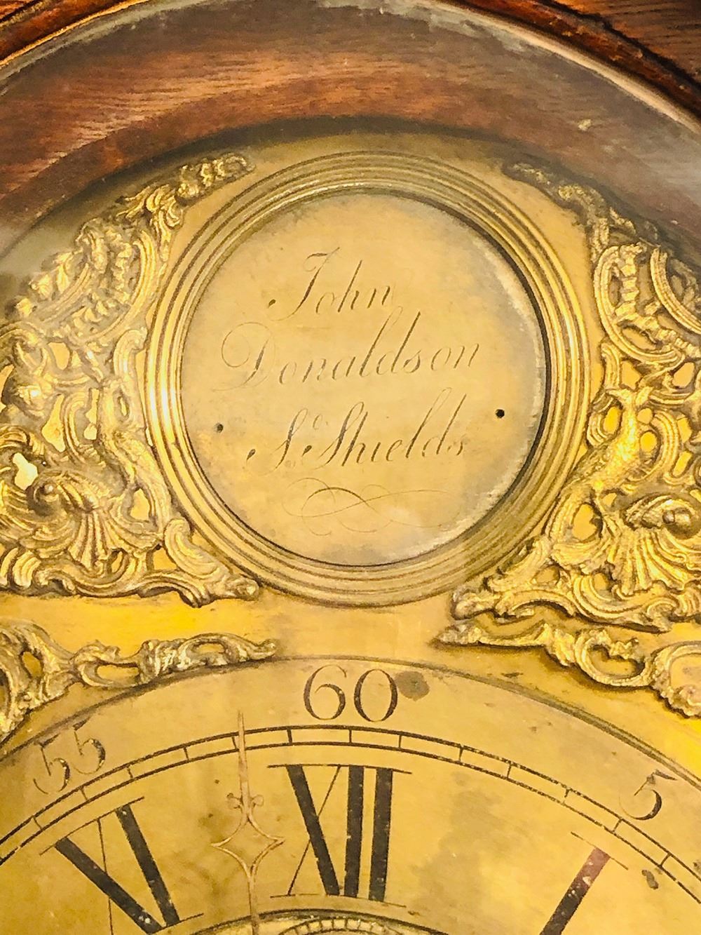 Scottish, Oak grandfather clock, John Donaldson S. Shields o ornate brass dial. Measures approx. 88” tall x 19” wide x 10” deep. From historic Litchfield, CT estate.