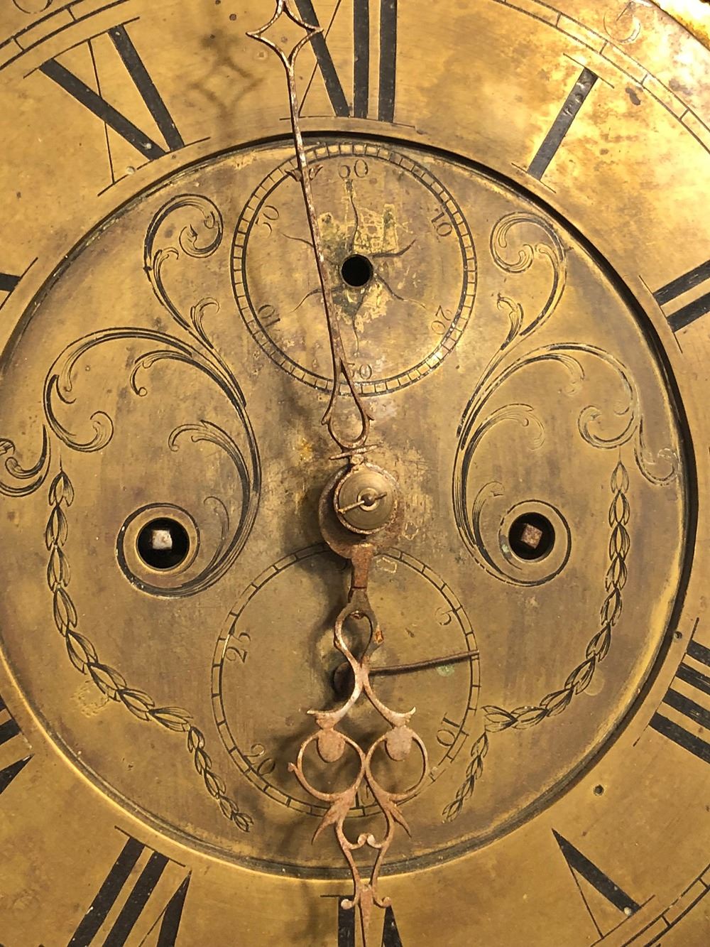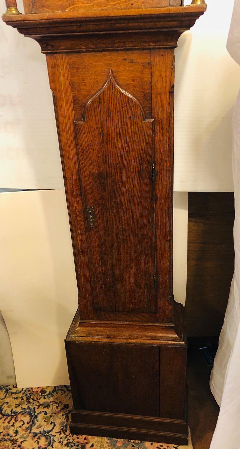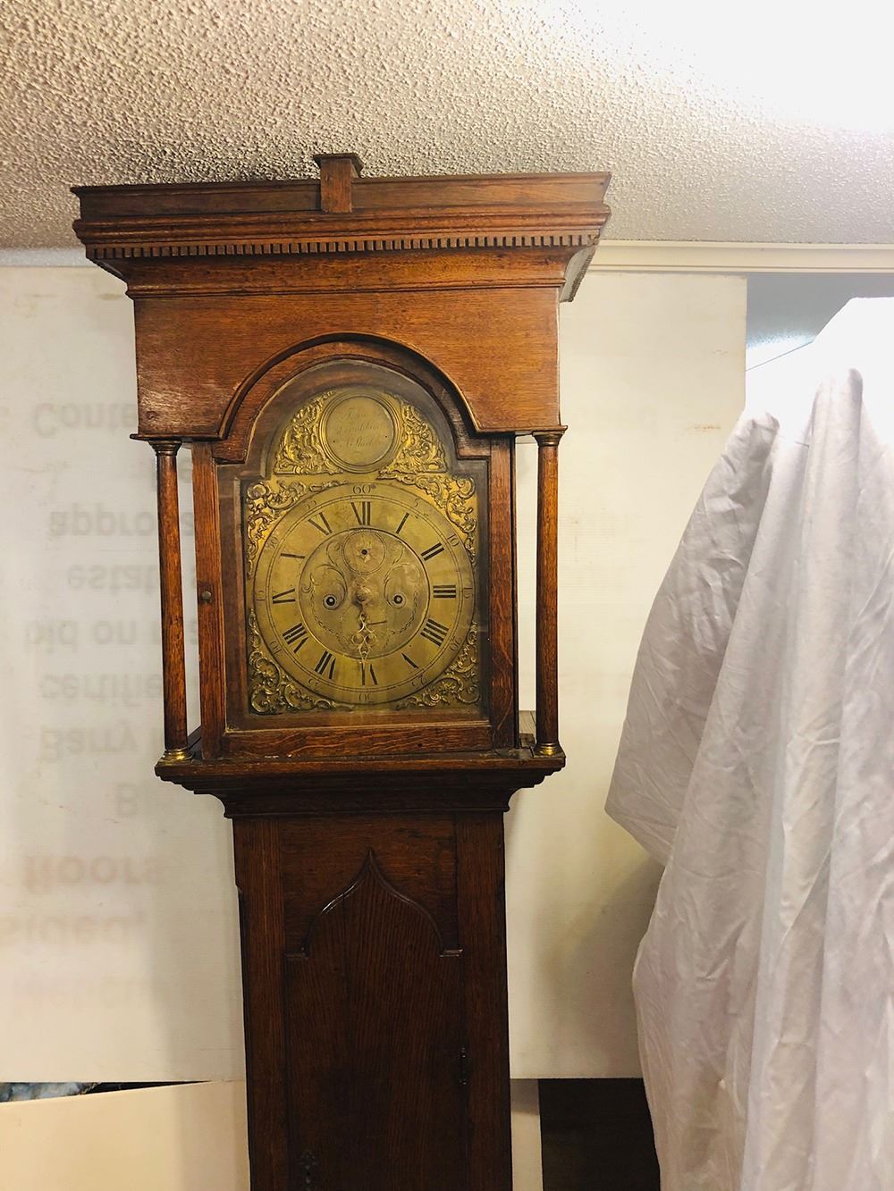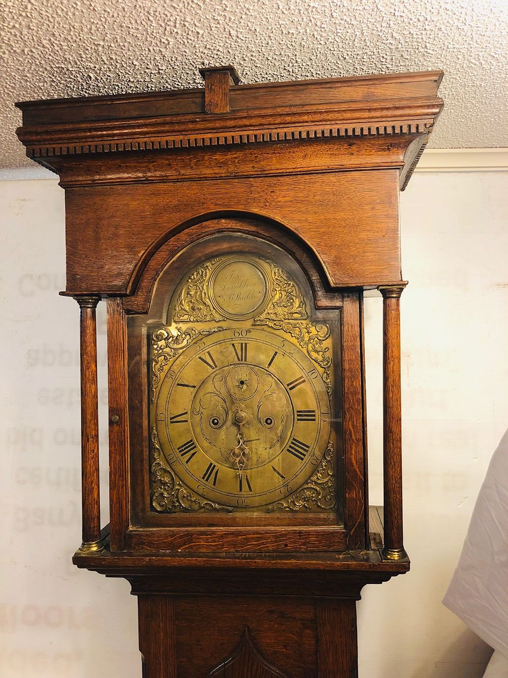 Scottish, Oak grandfather clock, John Donaldson S. Shields o ornate brass dial. Measures approx. 88” tall x 19” wide x 10” deep. From historic Litchfield, CT estate.