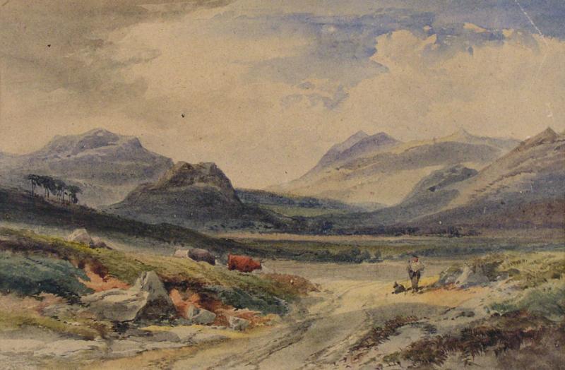 [19th century] SCOTTISH LANDSCAPE WITH FIGURE AND CATTLE watercolour on paper 8.75 x 13.25 in. (22.2 x 33.7 cm) signed "Leitch" under the matting