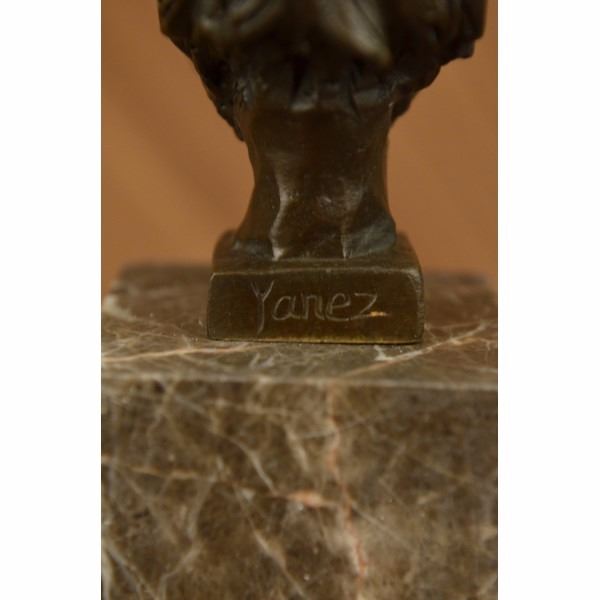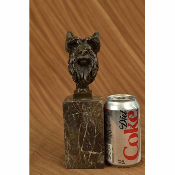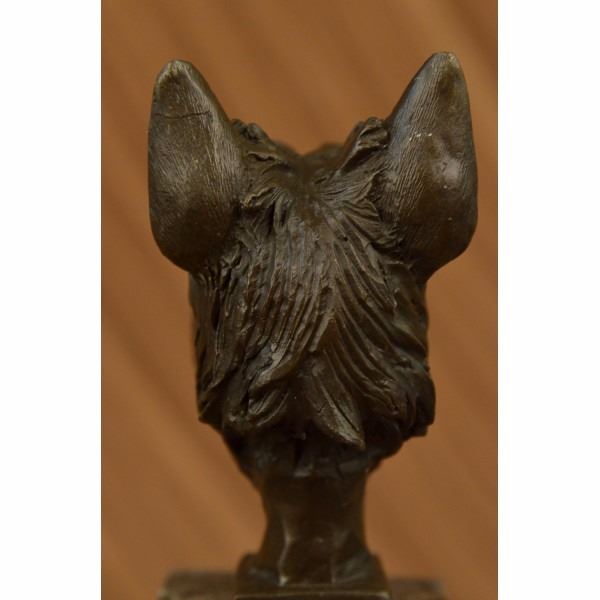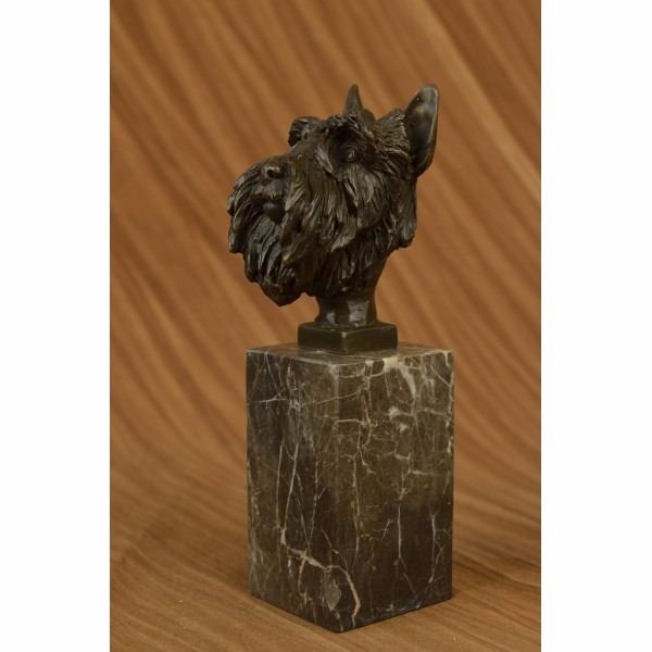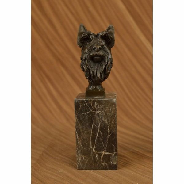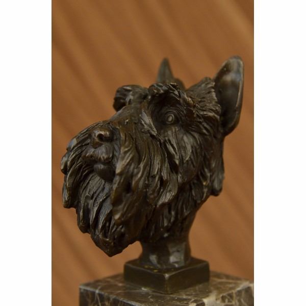 This in an adorably accurate statue of a Scottish terrier. Brave and alert, the Scottie is hardy and lovable. They are charming and full of character. Playful and friendly as a puppy, he matures into a dignified adult. It has a long coat that reaches the floor, each hair is distinguished from the next giving the appearance of a real dogs hair and a nice thick coat. His bushy eyes brows almost cover his eyes, but in the right angle you can see the detail a beauty in them. Two curtains of hair part at his nose, exposing his mouth and snout. The painted detail is what really makes this look like a real dog as it has a two tone patina. He is handmade of 100% bronze and cast using the Lost Wax Method and is signed by artist Yanez. Condition: This sculpture is in a perfect condition. Condition: This sculpture is in a perfect condition. Bronze Dimensions with Marble Base:Height 7" x Width 2.5" Marble Dimensions: 2.5" X 2.5" Height without base: 5" Weight : 4 LBS Inventory : 61X24843616